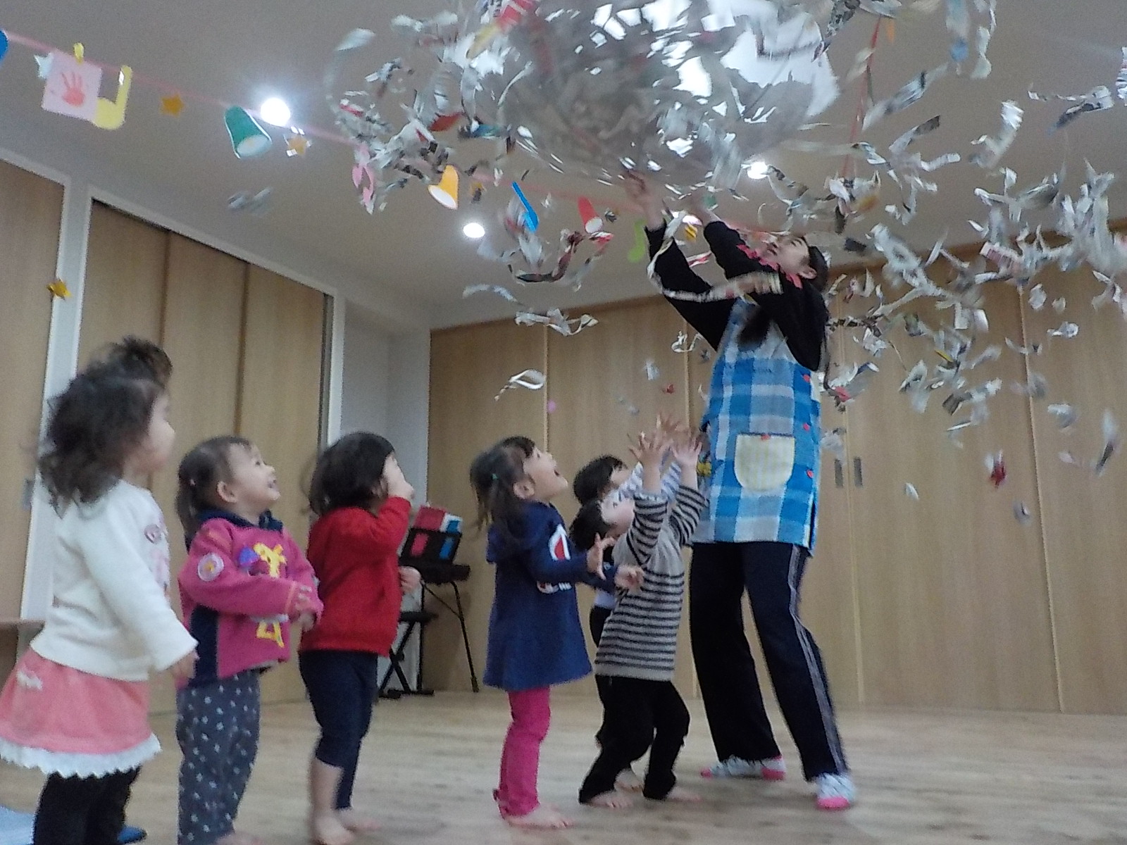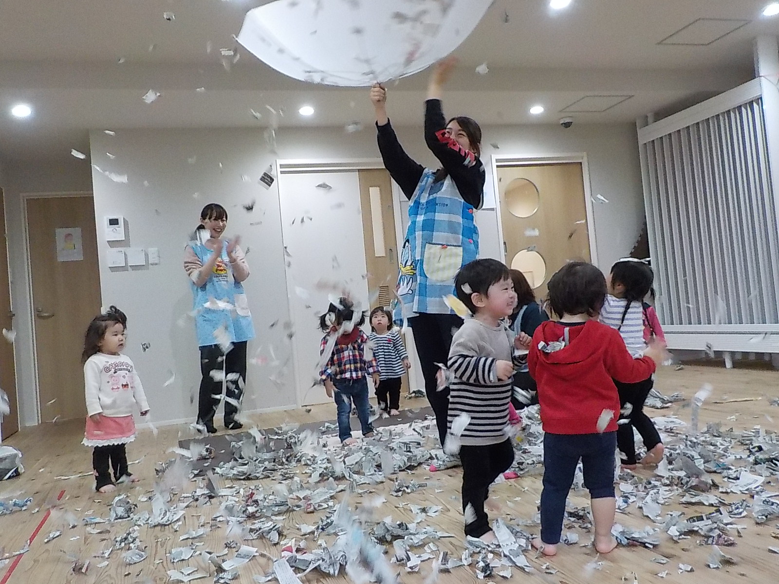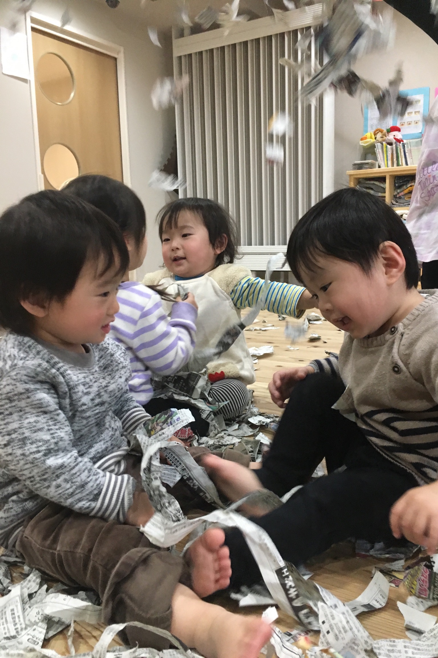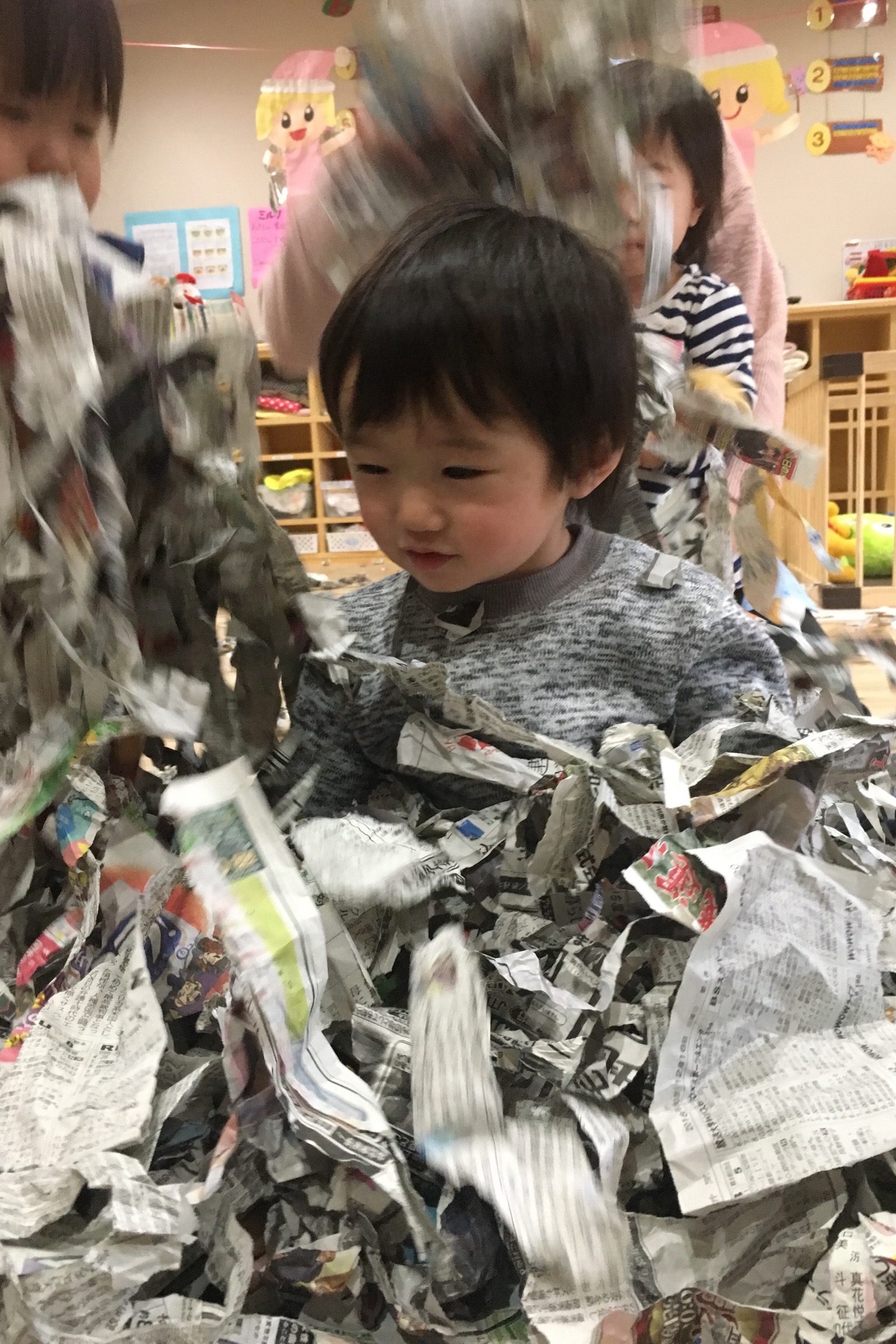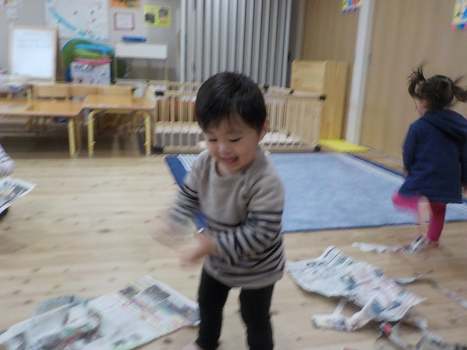 今日は雨が降っていたので、お部屋で新聞紙を使って遊んだよ♪