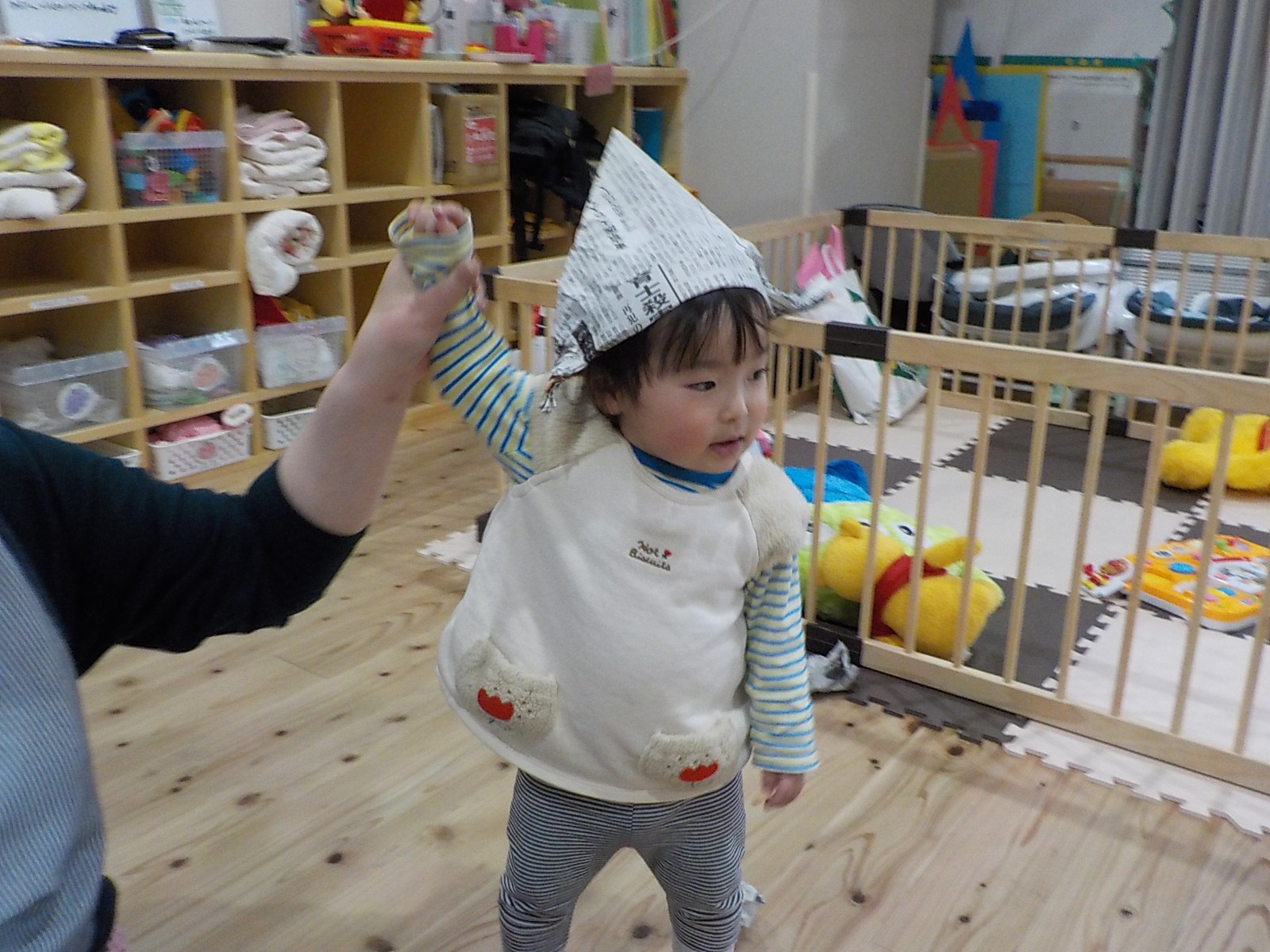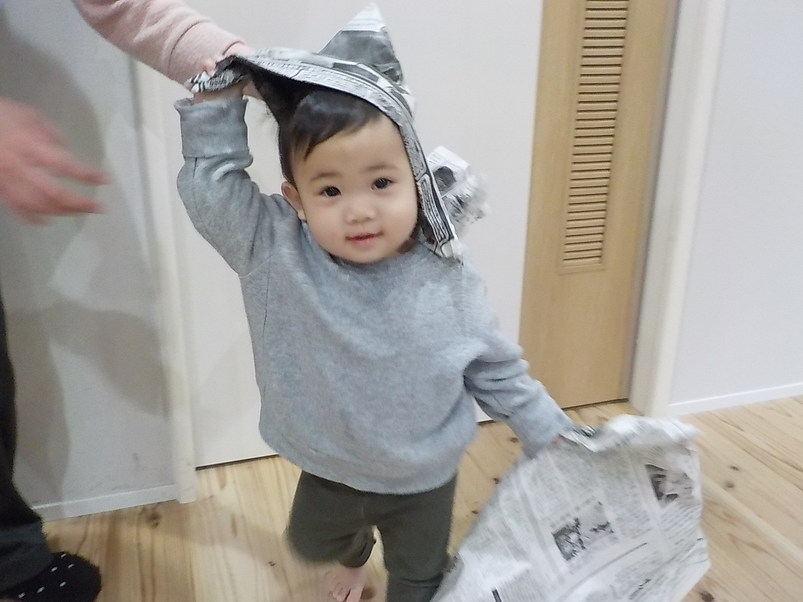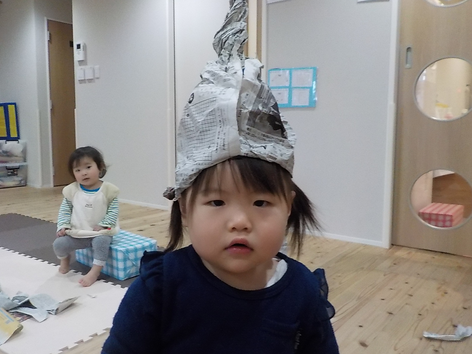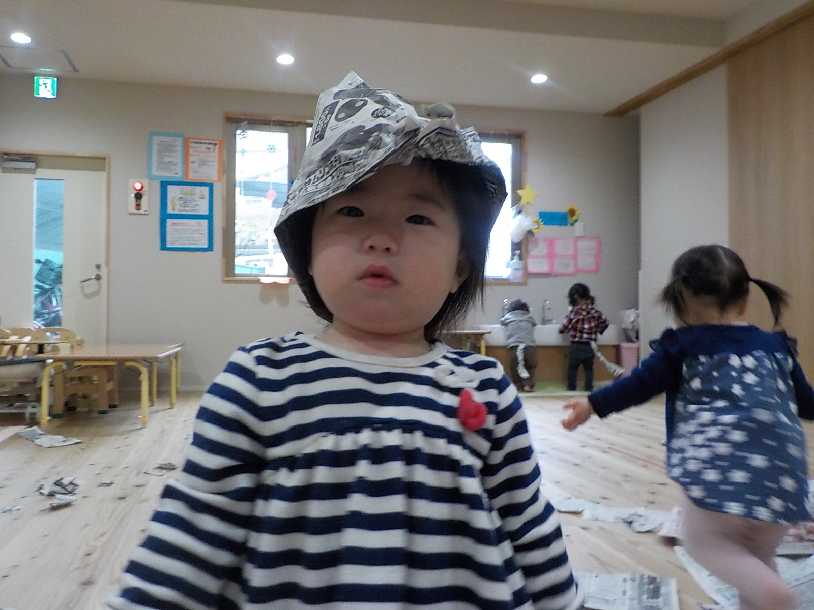 すご~い!新聞紙の帽子だ!(*^▽^*)