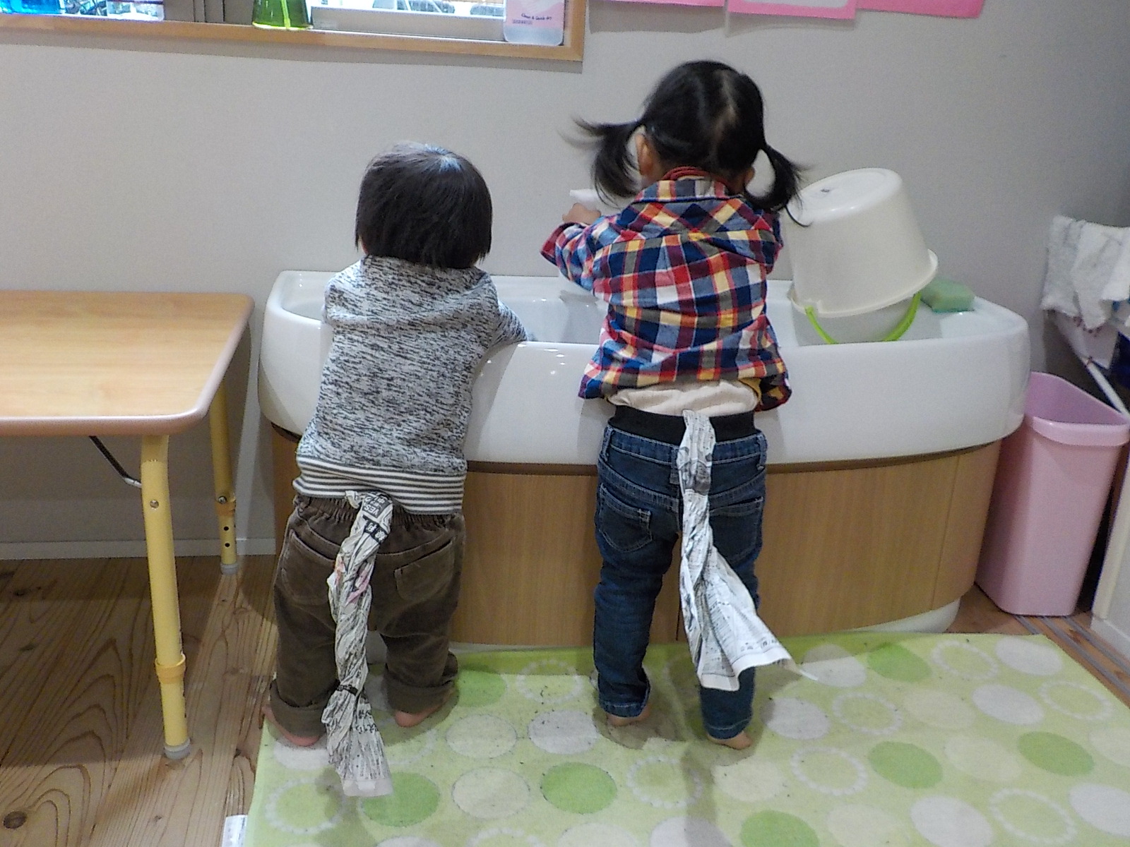 あれあれ?手洗い場にいるお友だちのおしりに何かついているぞ?