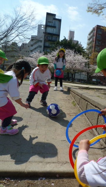 フープは転がしたり、遠くに飛ばしたり、ケンケンパをしたり・・・遊び方様々!!
