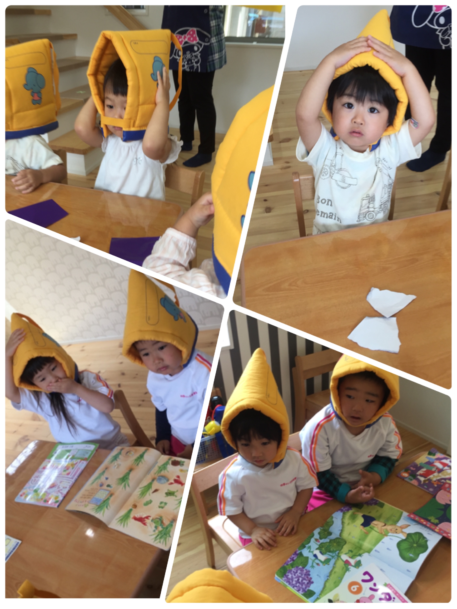 みんな防災頭巾をかぶって頭を隠して!!