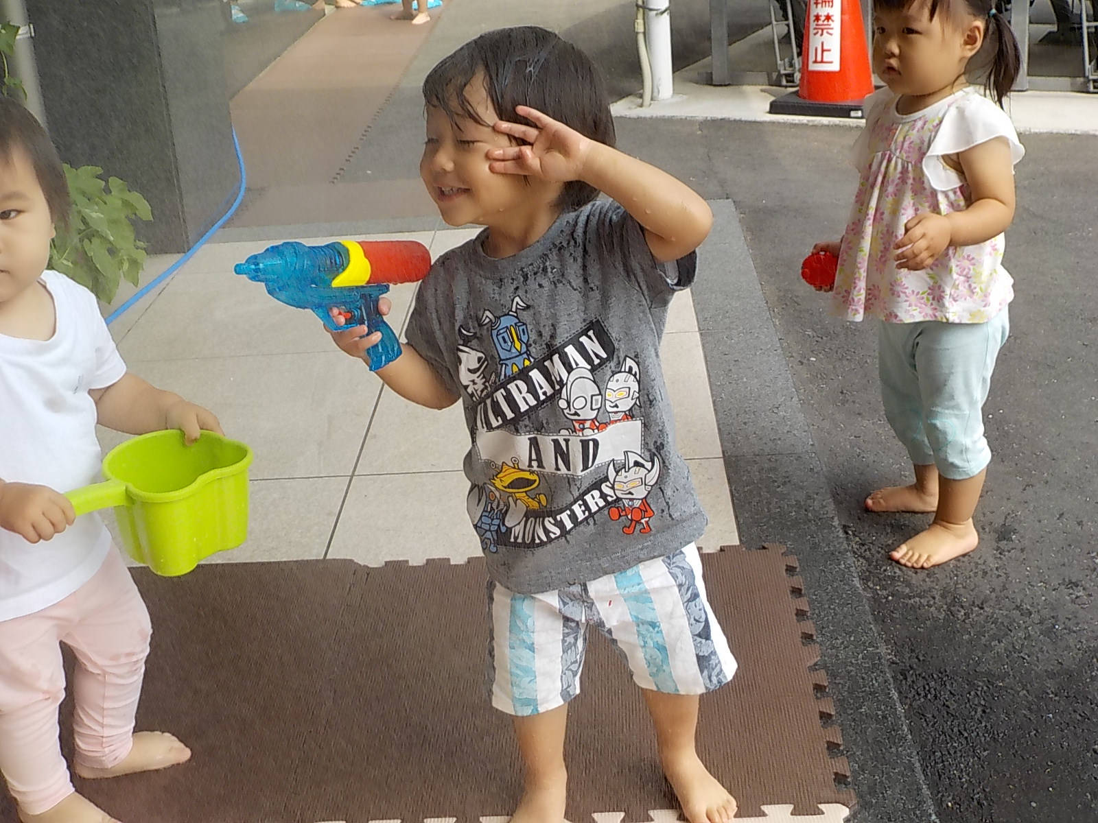 大きいお友だちのみんなは先生と水の掛け合いを楽しみました(o^^o)