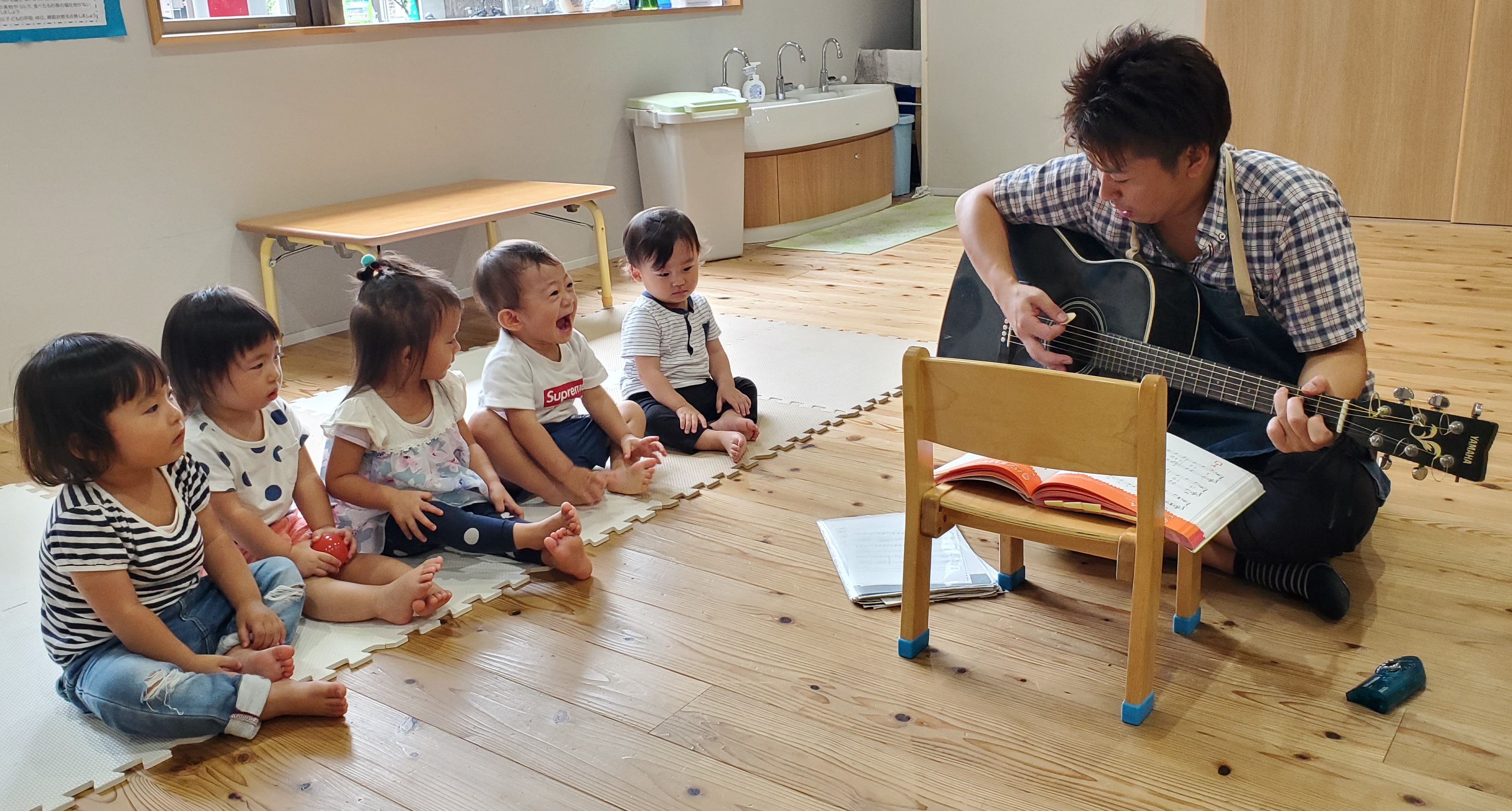 ギターの上手な先生と歌を歌いました。初めて見るギターに興味深々。