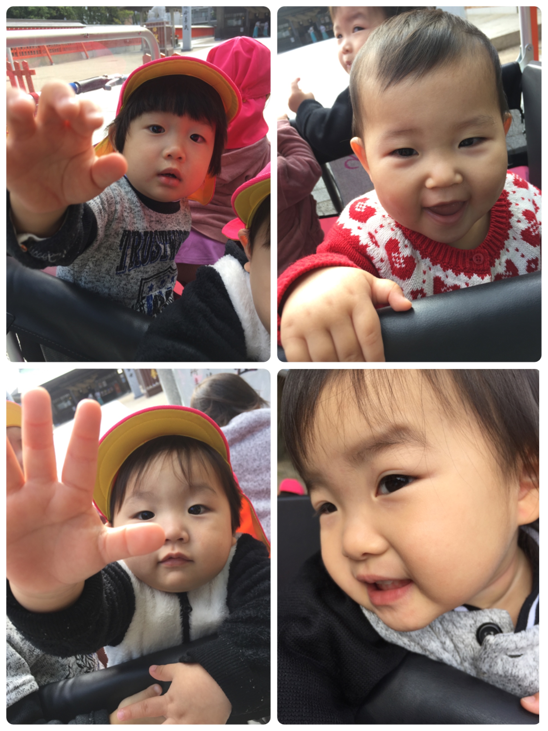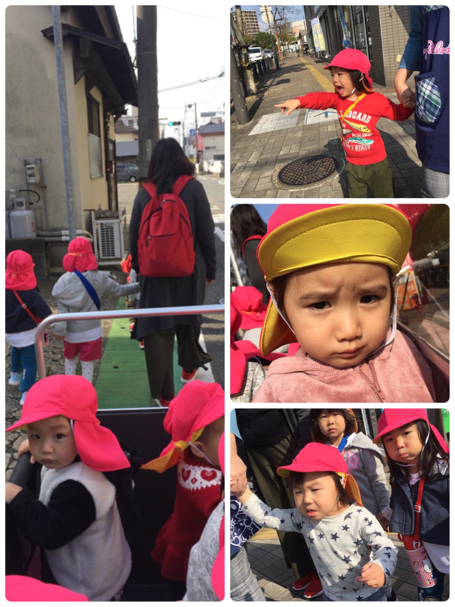こんにちは。吉塚園です。 明日に迫った生活発表会。みんなドキドキです。 朝の会もしっかりできました。 朝の会のあとは少し練習をして息抜きにいつもと違う公園へ遊びに行きました。 道中、お友だちに会いました。 公園へ行き、犬や猫、バスを見て大喜びしたり、葉っぱの色の移り変わりを見て来てました。 そして近くの神社に明日の成功をお祈りしてきました(。>人<) 明日はいよいよ本番です。 ドキドキしちゃうかもしれないけど可愛い衣装やかっこいい衣装着て頑張ろうね!