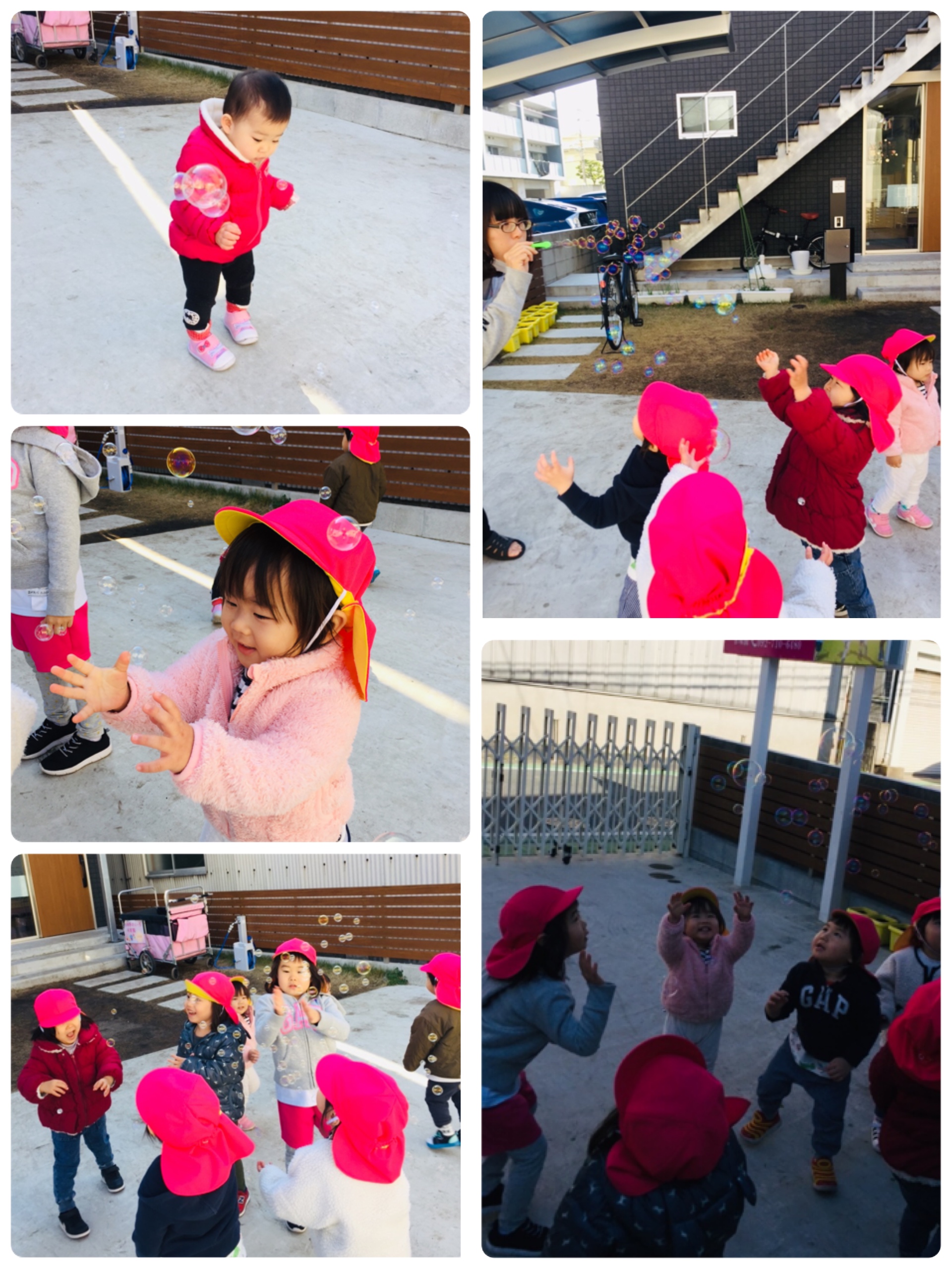 三が日が過ぎ、保育園へ来てくれるお友達も増えました☆ みんな「明けましておめでとうございます」と 挨拶してくれました(^O^) 朝の会をして、 体操しました☆ そのあとは園庭へ♪ 寒いけれど元気いっぱいのお友達( *´艸`) シャボン玉もして沢山遊びました♪ お部屋に戻ってブロック遊びや あおぞら組のお姉さんたちはおえかきもしましたよ(*^^*) 久しぶりの登園だったお友達も 最初はお母さん達と離れたくない!と言っていたお友達も すぐに慣れ、元気いっぱい遊べました☆