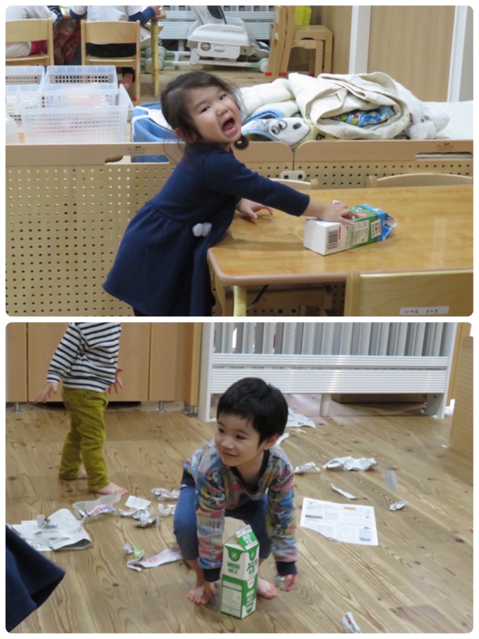 新聞紙を先生に長くちぎってもらって、牛乳パックに入れて引っ張ってみたりと、とっても楽しんでいました♡