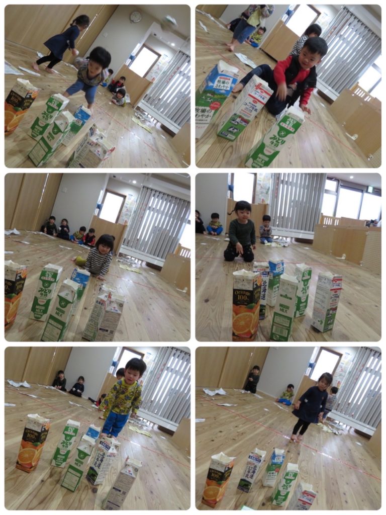 その後は、牛乳パックを使ってボーリングをしました!!