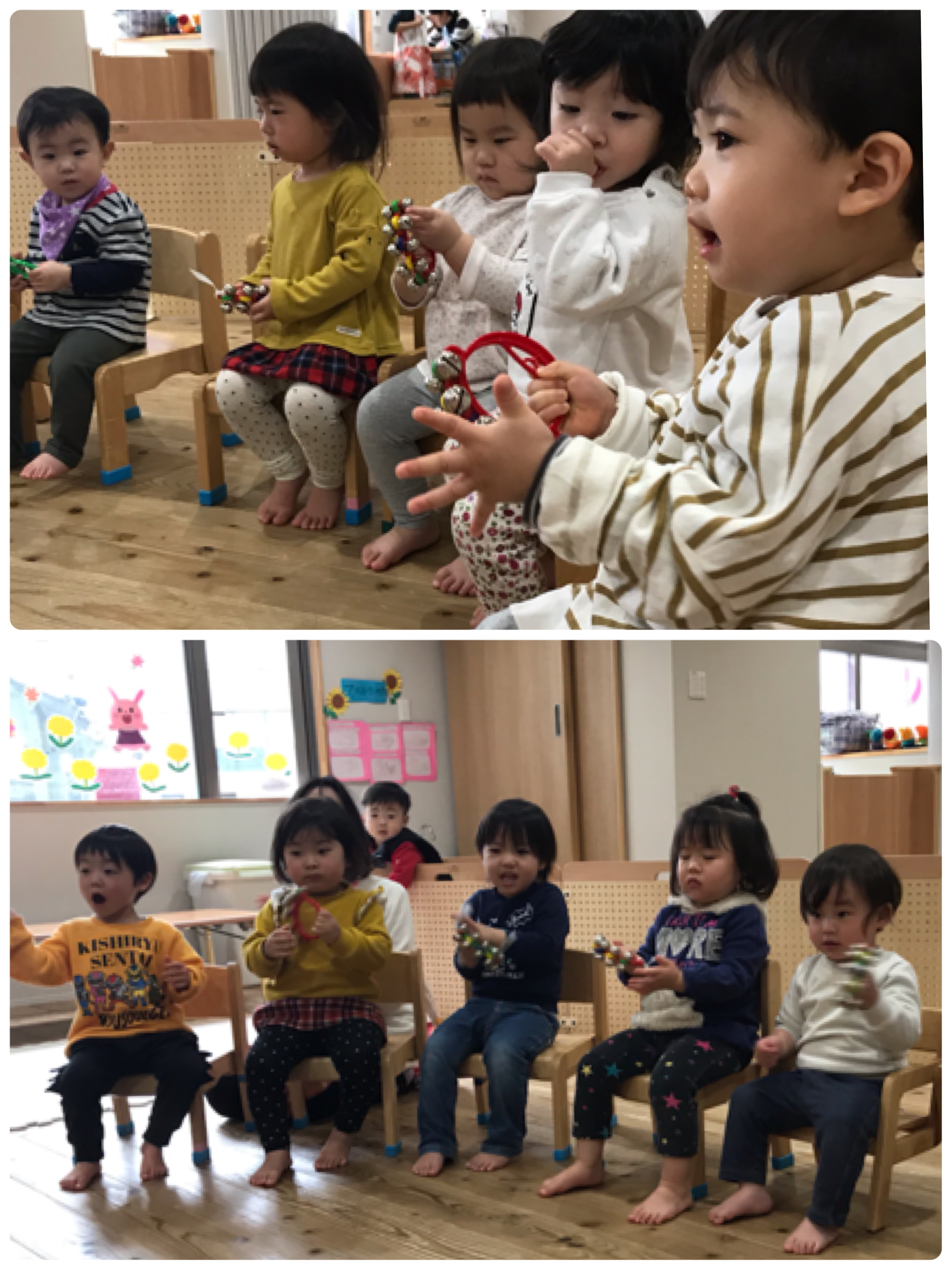 おひさま組さんとほし組さんは、椅子に座り朝の会をました。タンバリンを使いお名前呼びをしたり、鈴を持って楽しく歌いました(*´꒳`*)