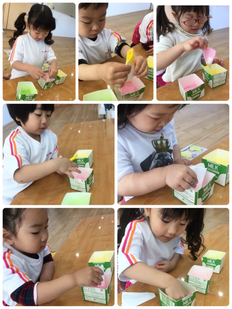 こんにちは☆吉塚園です♬ 今日も元気な吉塚園のみんな(*´▽`*) あおぞら組のみんなはにじ、ひかり組と一緒にお姉ちゃんお兄ちゃんになれたのがとても楽しいみたいです♡ ほし、つき組もとーってもおしゃべり上手♡ 今日も浸し染~(*´▽`*) みんなの作品の出来あがりがすっごく楽しみです♡