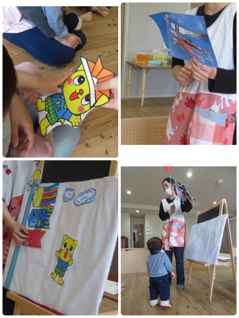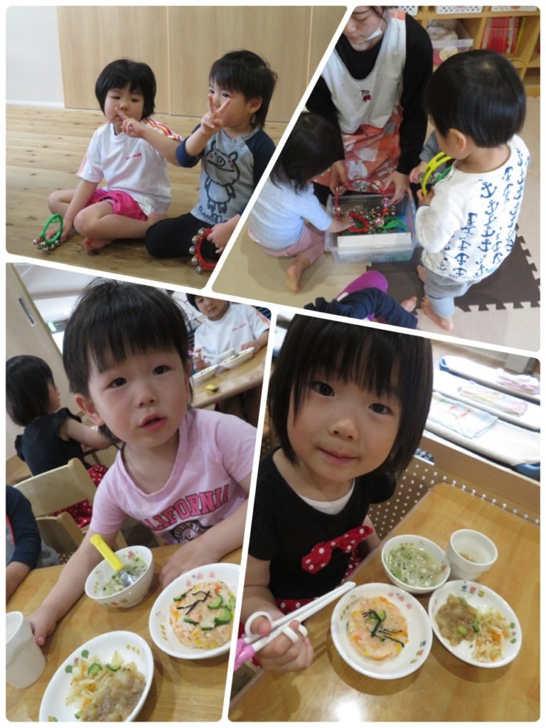 お友達が揃うまで仲良くブロックで遊びました。みんな揃って朝の会。今日も元気な歌声と返事が響き渡りました♬ その後は、子どもの日会がありました。 先生のお話を上手に聞いています。 こいのぼりに興味津々のFくんです。 パネルシアターの猫に興味津々のつきぐみさんでした。 その後は、リトミックを楽しみました!FくんとMちゃん仲良しこよしです(๑>◡<๑) 鈴を持ってリズム遊びも楽しみました! おいしい給食の後はお着替え。 とても上手に着替えるRくんです。 明日もたくさん遊ぼうね!