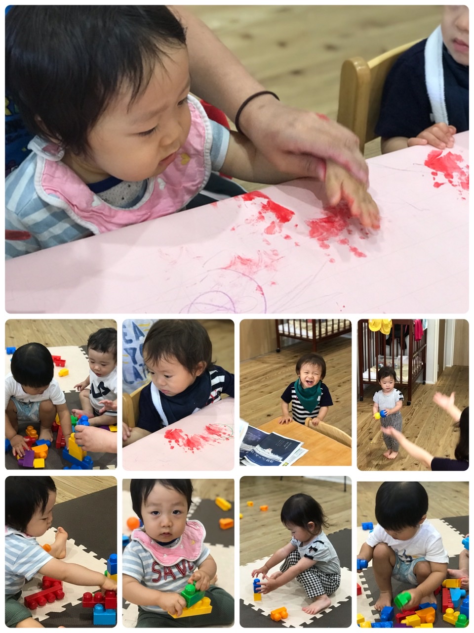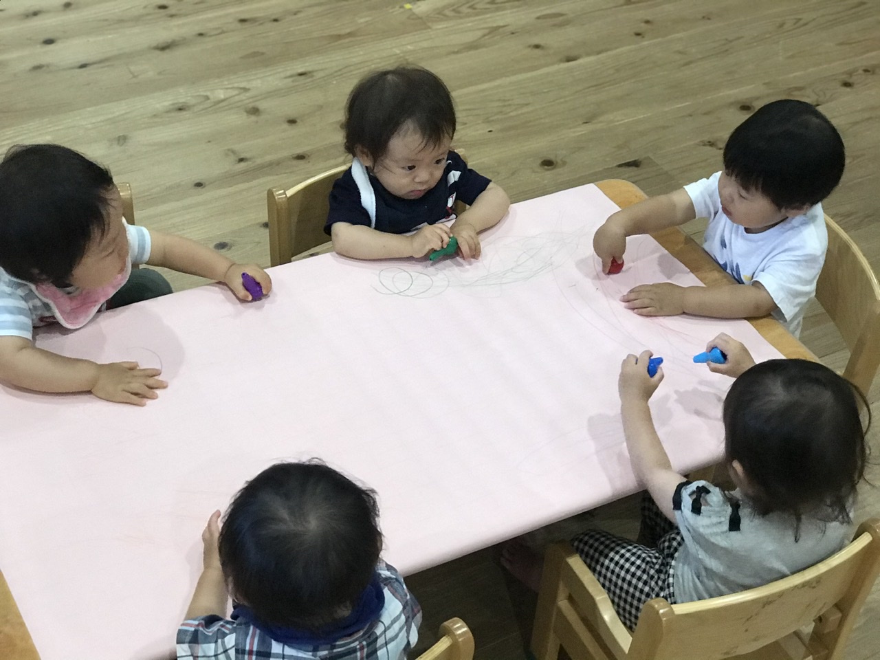 おひさま、ほし組は大きな紙になぐり描きを楽しみました。紙にいっぱい描くと、ブロックやボールで楽しく遊びました☆