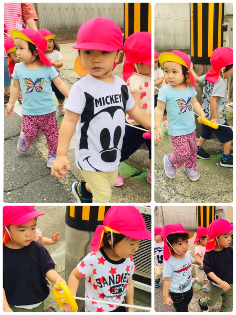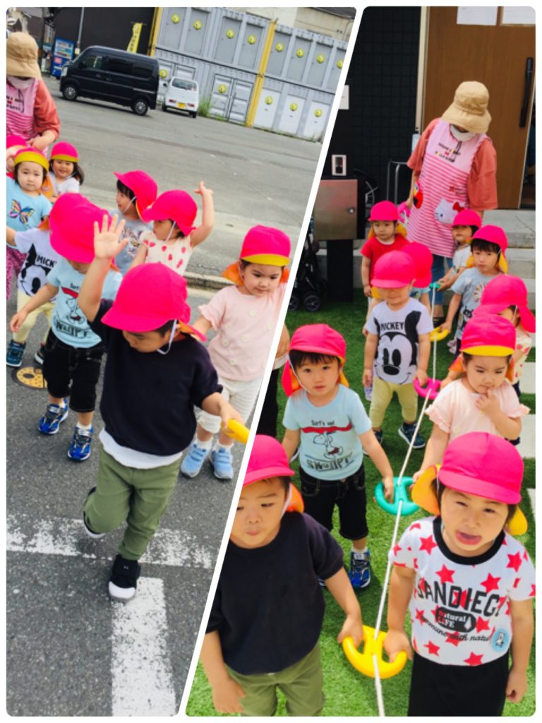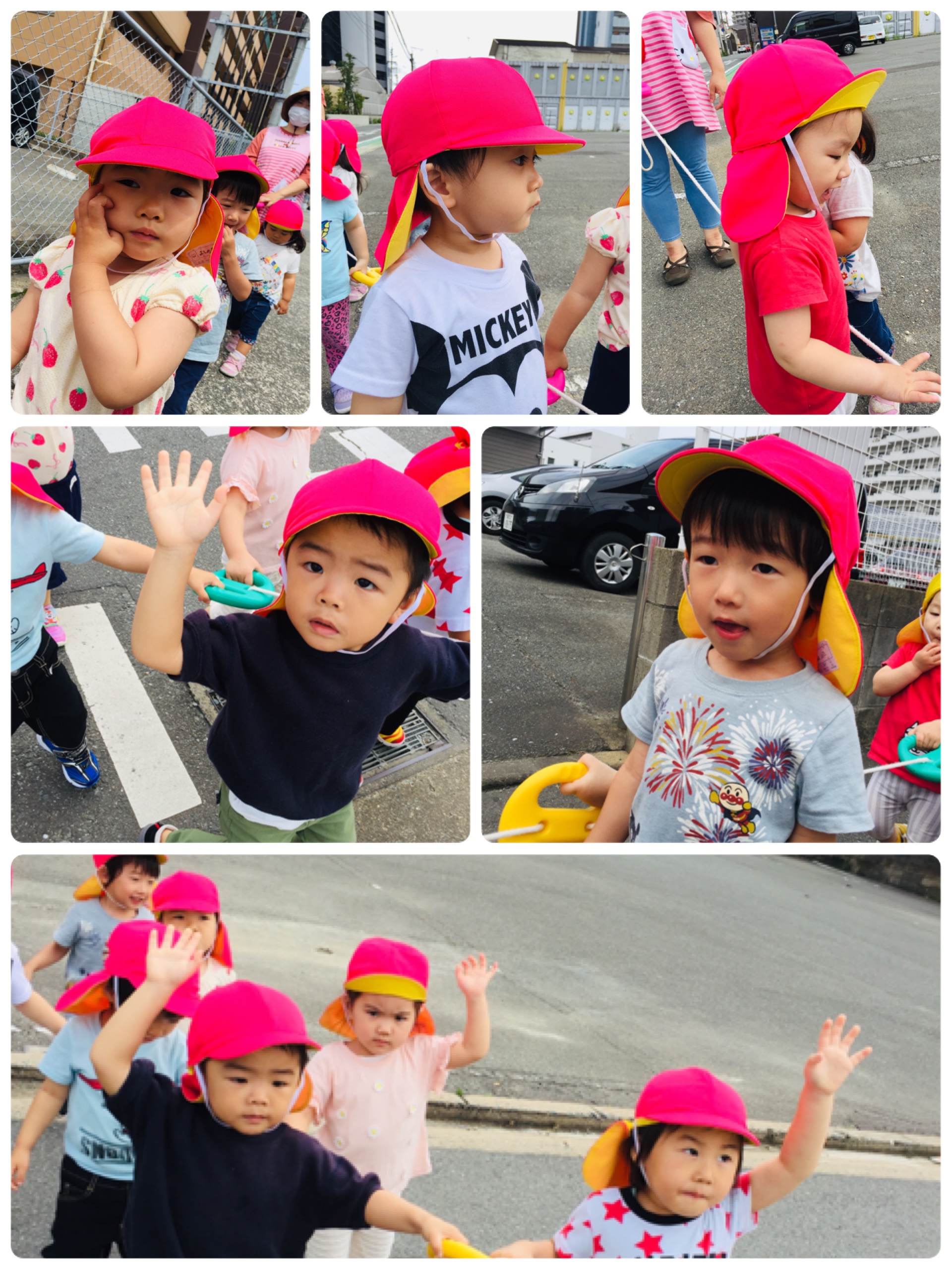 ほし組さんの時はお散歩カーに乗っていたのに、今ではみんなしっかり手を挙げて横断歩道を渡っています(≧▽≦)
