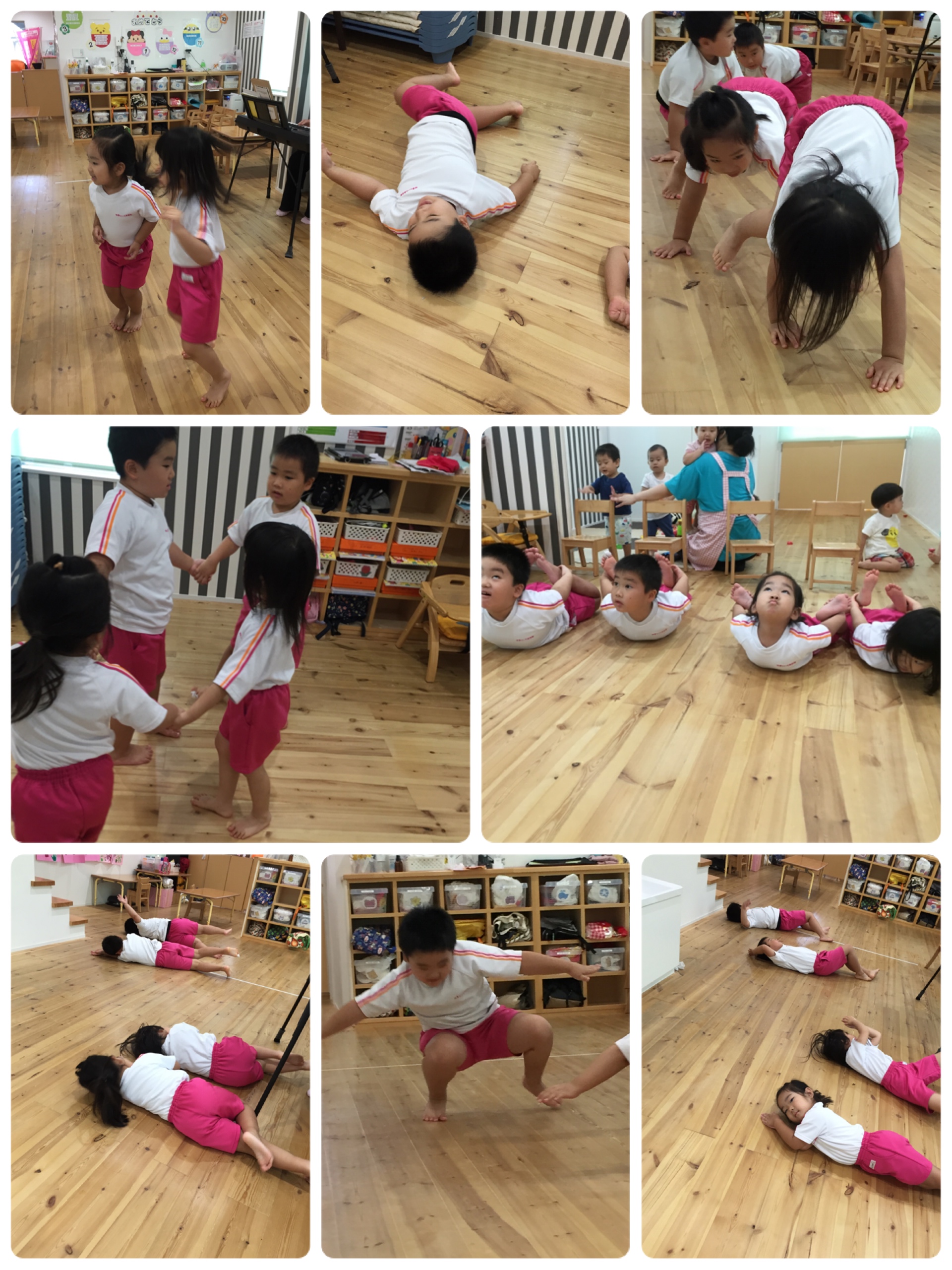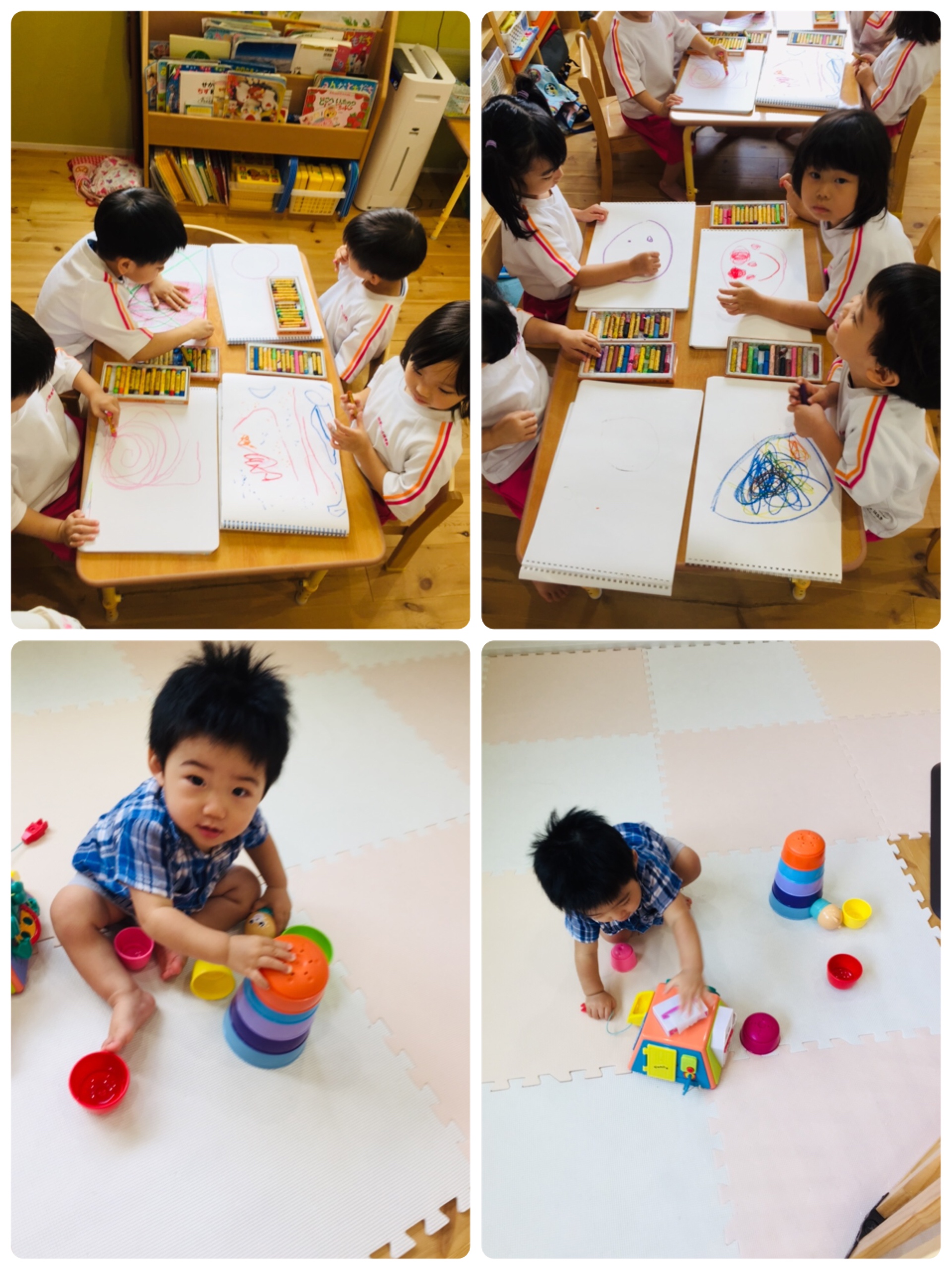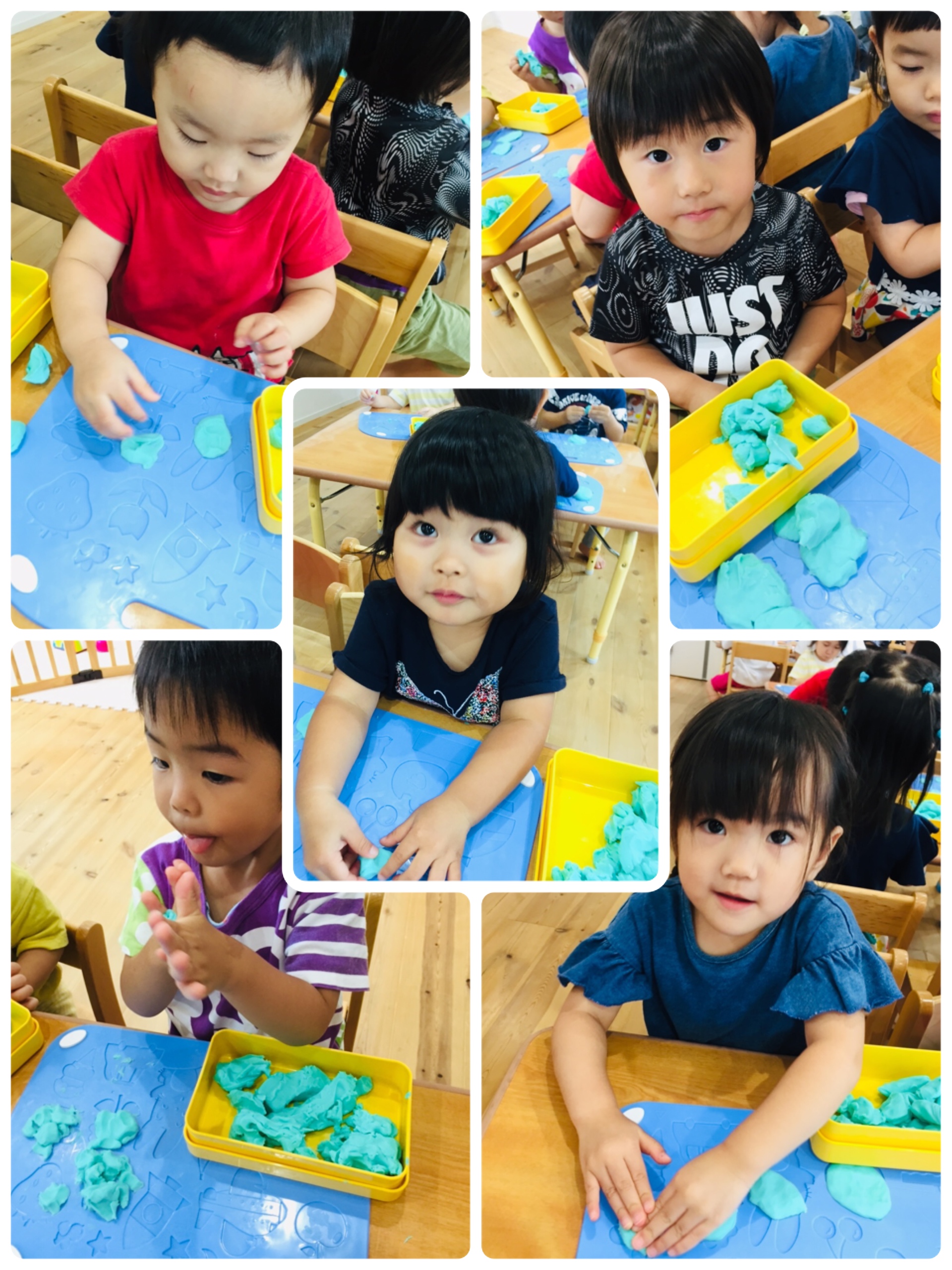 こんにちは!吉塚園です☆ 昨日の台風のせいで朝園庭が大変なことになっていました(@_@;) 皆さんは大丈夫でしたか? 今日の朝の会♬ みんなの元気なお返事気持ちがいいです(^O^)/ 1階のほしぐみさん♡ Kちゃんはカメラで撮られるのが恥ずかしいのかな? ほしぐみがおもちゃで遊んでいるころお兄さんたちは体をたくさん動かしました(^O^)/b 2階ではつき組さんが粘土遊びをしていました(=゚ω゚)ノ コネコネ♪ 何が出来上がったかな♡