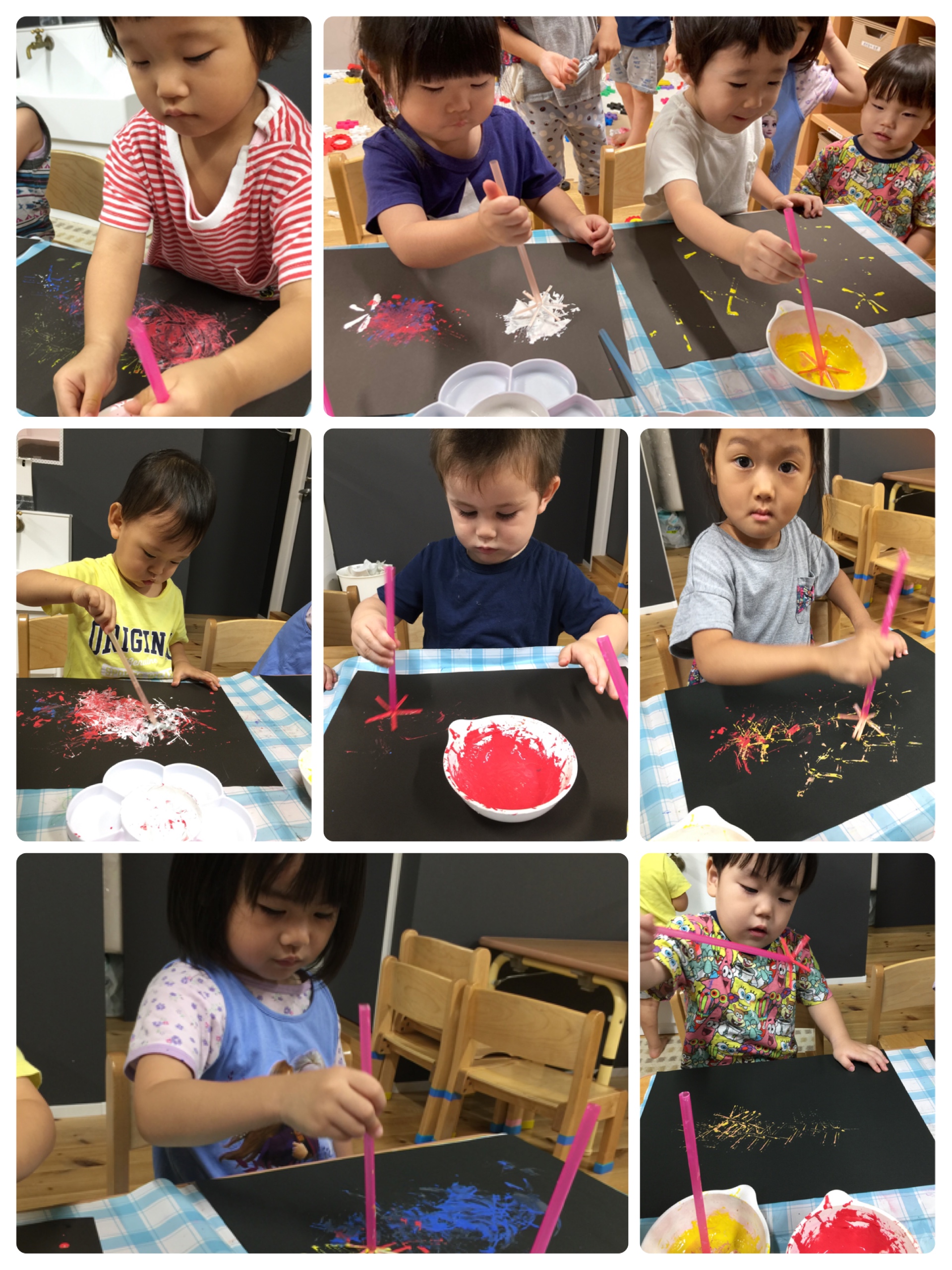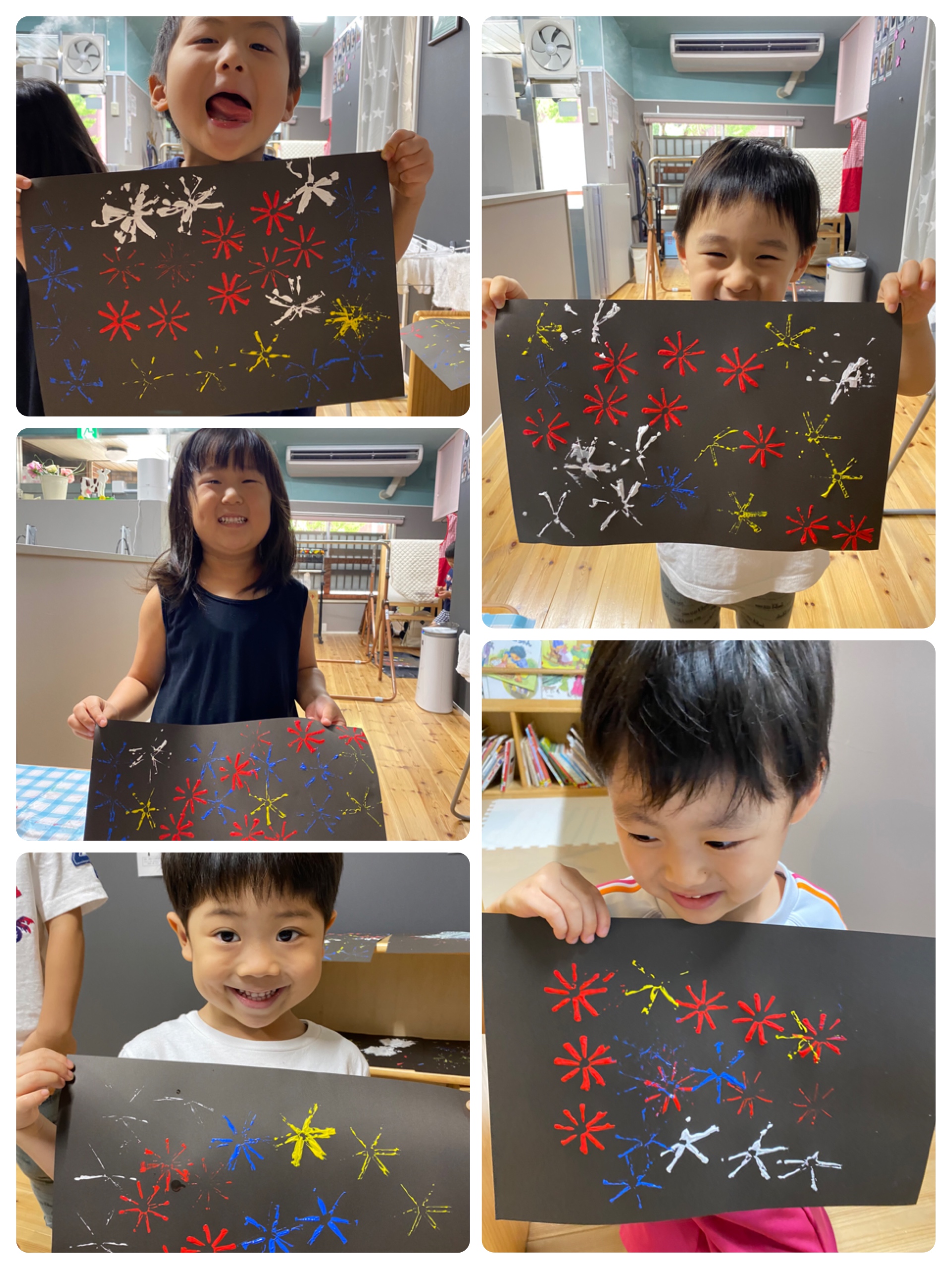 皆さんこんにちは(^^♪ 舞鶴園です 本日は絵具を使って花火を描きました ストローを上手に持ってポンポンッ 夏らしい一枚できました