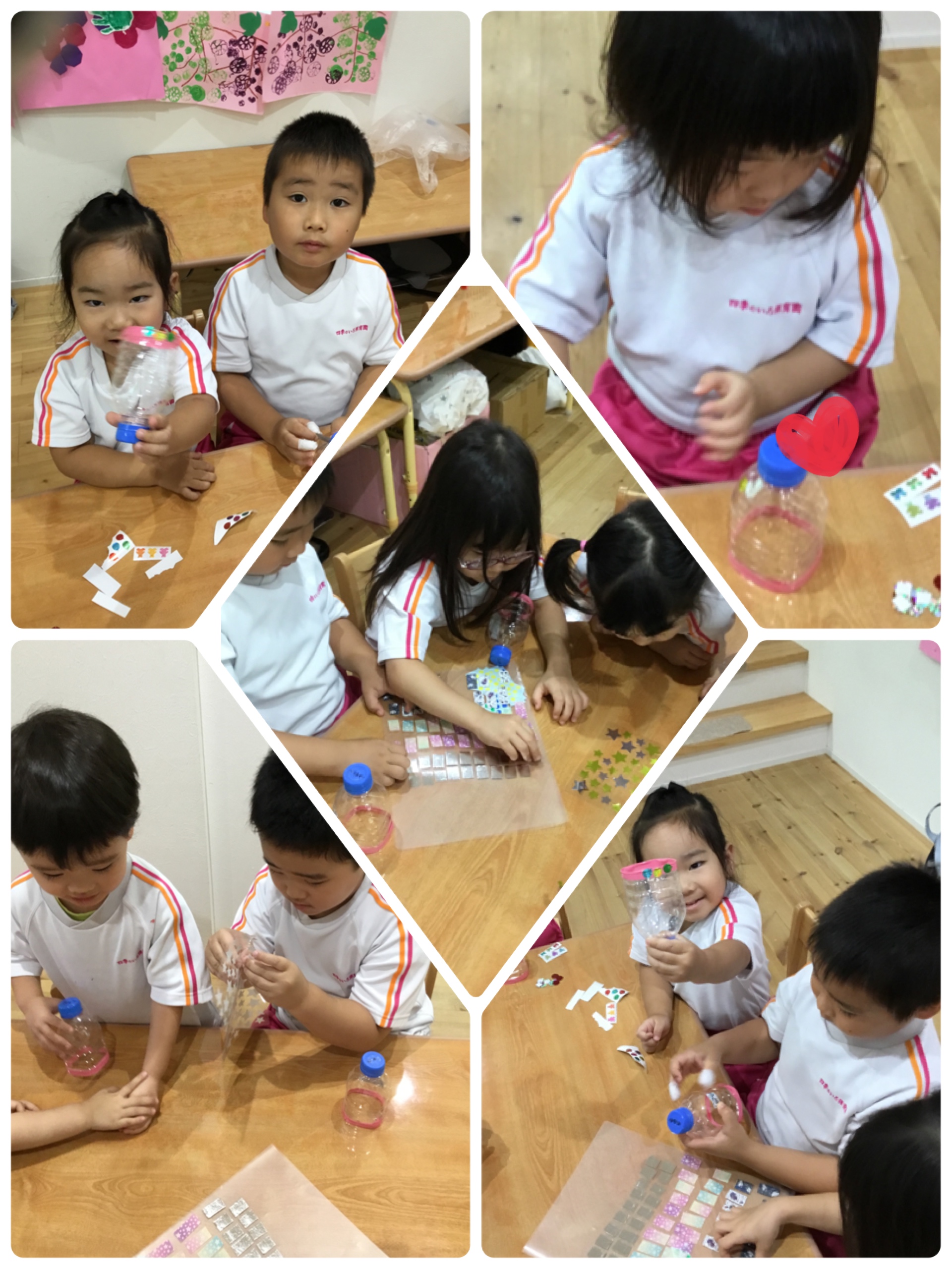 その頃あおぞら、にじ、ひかり組さんはペットボトルに可愛い飾りつけをしています♪
