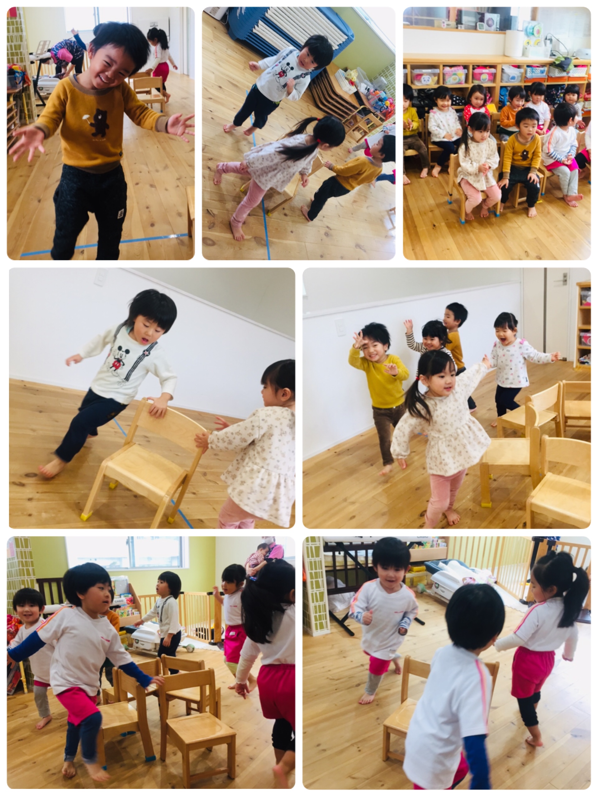 その頃、つきぐみさんとあおぞらぐみさんはイス取りゲームをしました!