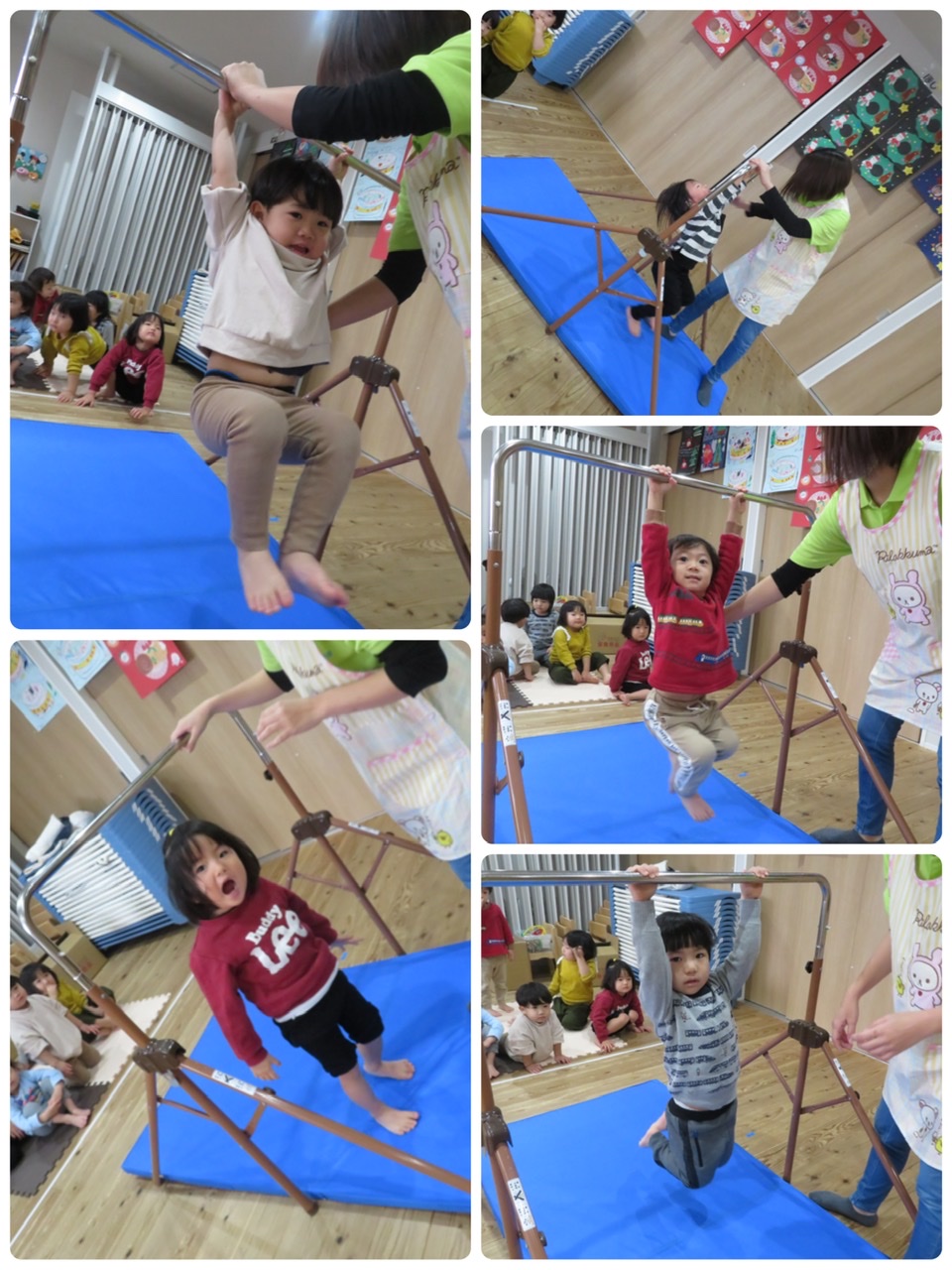 鉄棒では、上手にぶら下がったり、お兄ちゃんたちの真似をしようと頑張っている子もいました!!☆