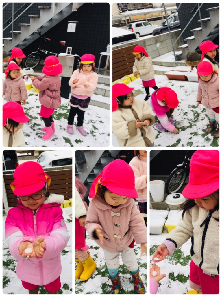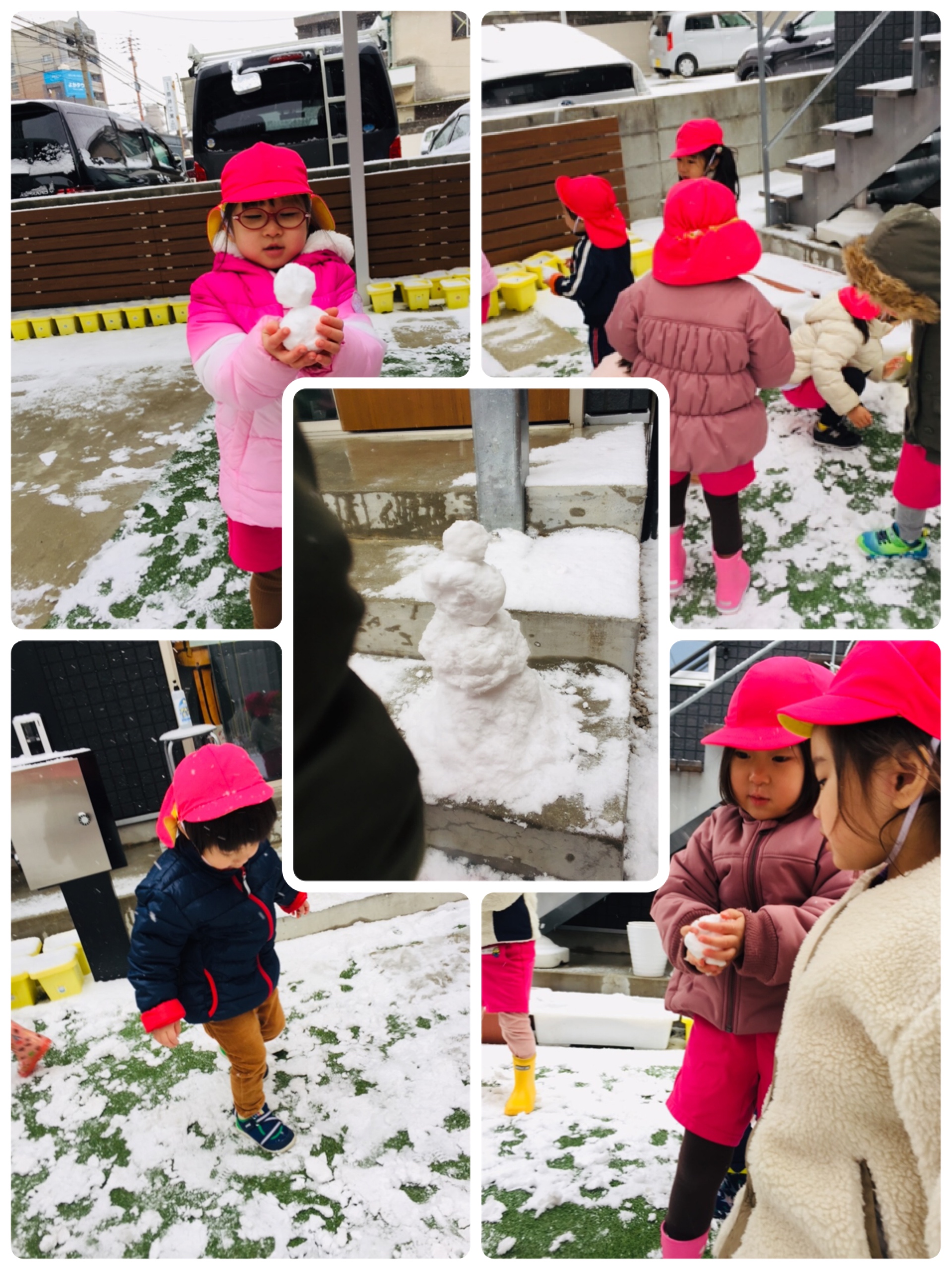 つき、あおぞら、にじ組は園庭で雪だるまを作りました(^^)/