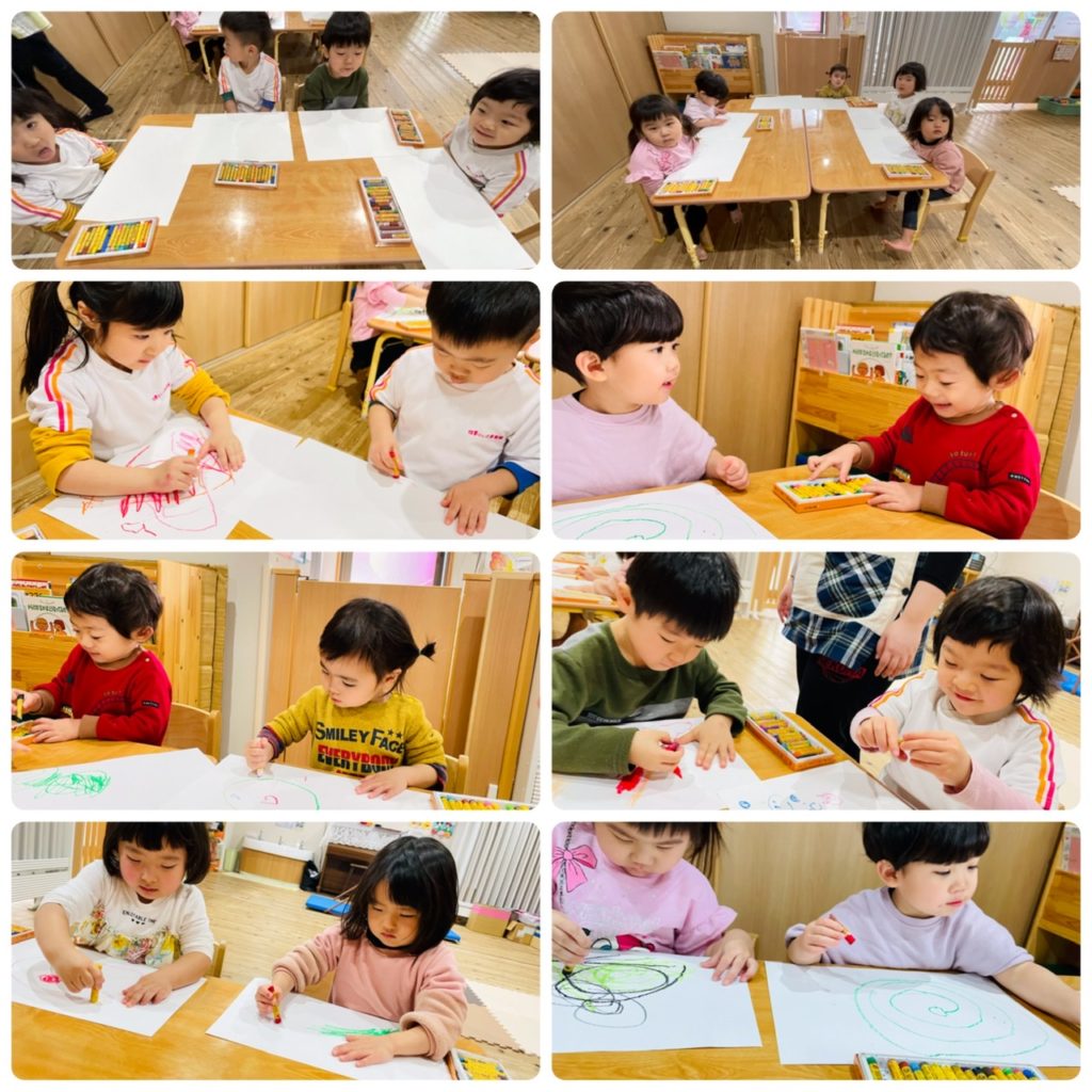 おひさま、ほし組さんは机に敷かれた紙にコロールやクレヨンで自由にお絵かきを楽しんでいましたよ(*≧∀≦*)