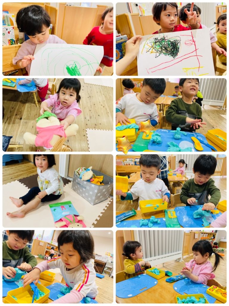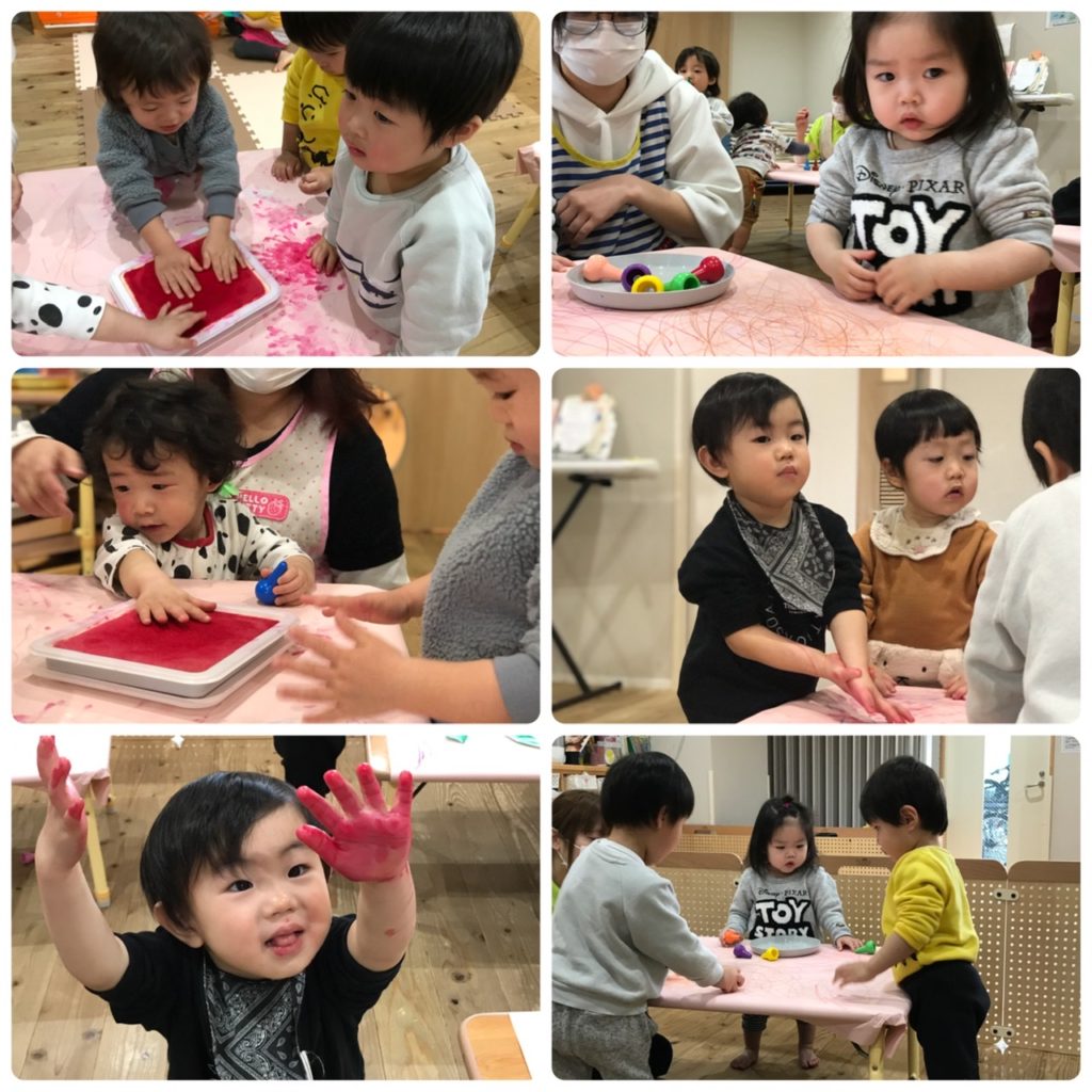 お絵描きだけでなく、折り紙をビリビリ破いてみたり、手形スタンプをしたりとたくさん楽しい事をしました(^O^)