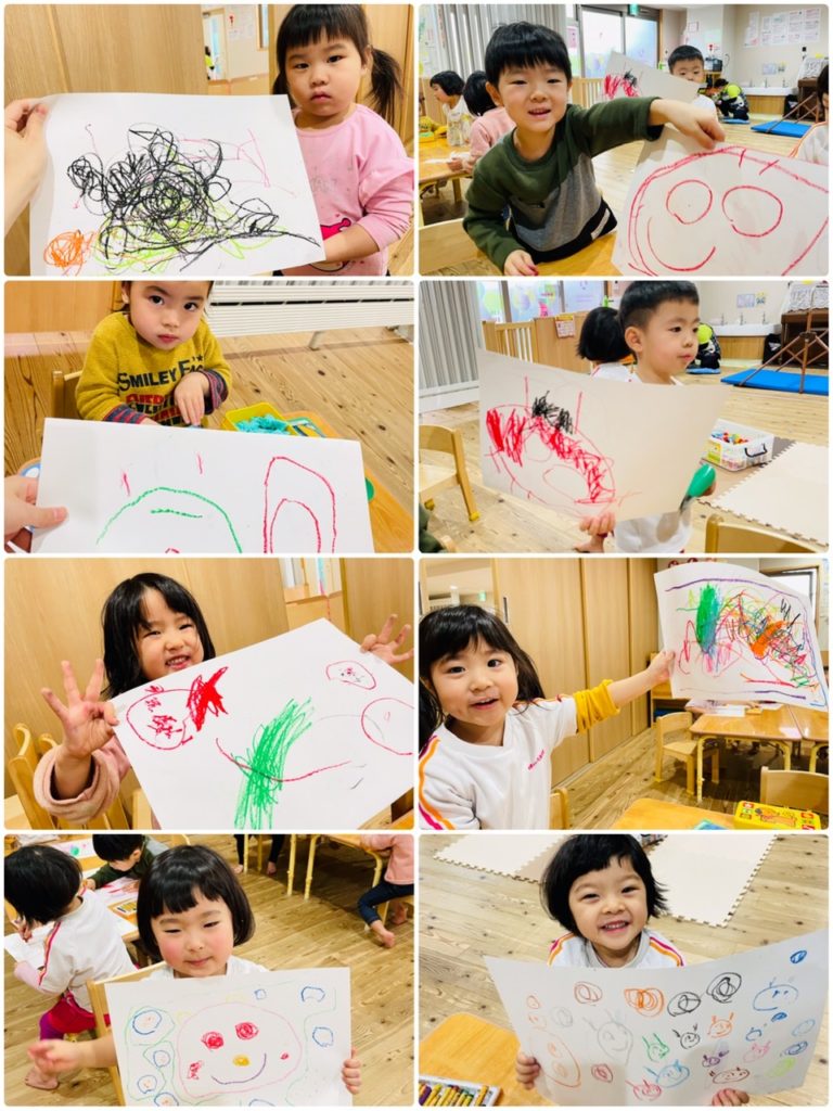 つき、あおぞら、にじ組さんは、昨日の豆まきの出来事を思い出しながら、絵を描きました!