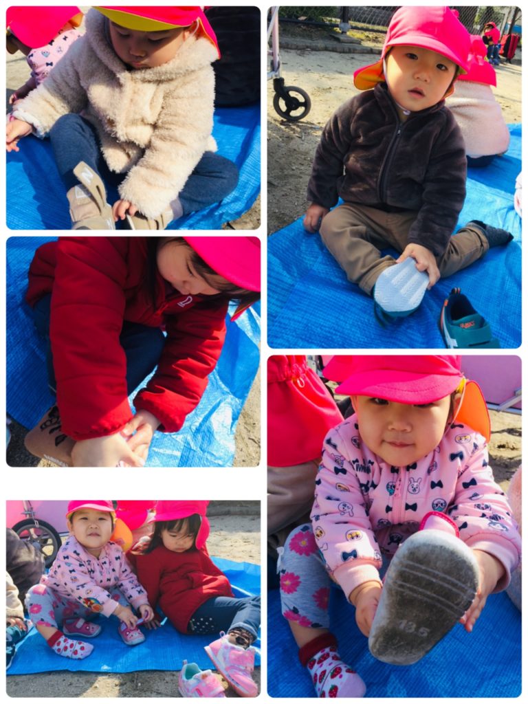 お散歩カーに乗ってきたお友達は公園についてから靴を履いて(*^^*)