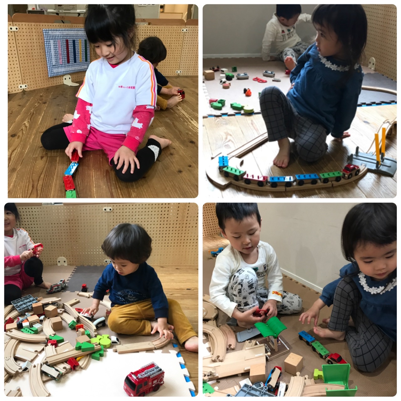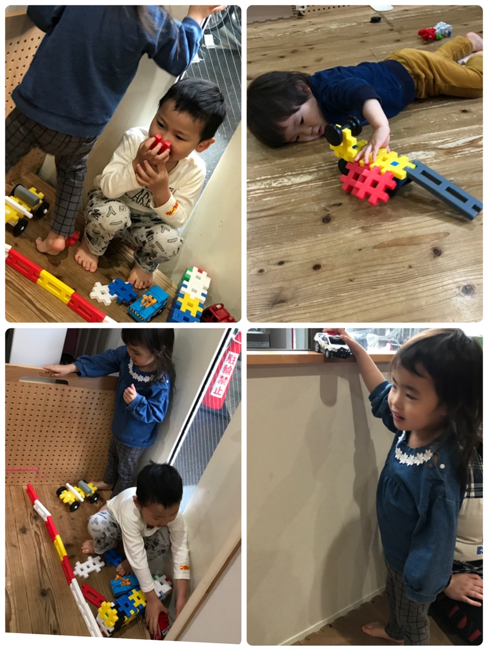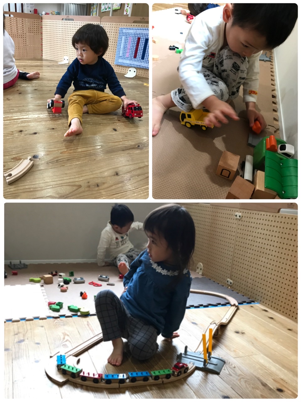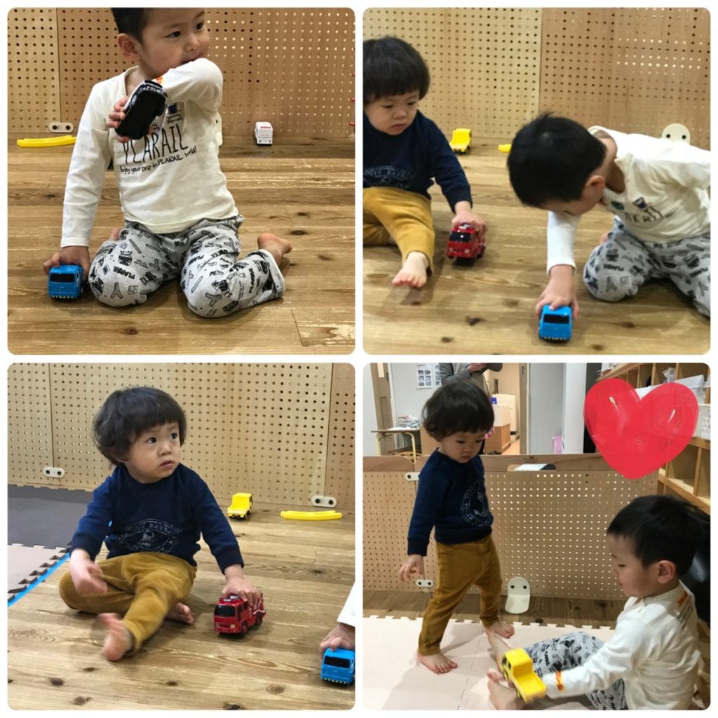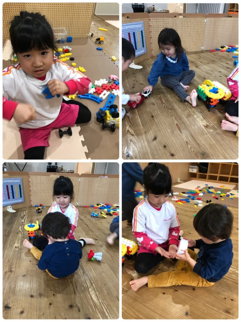 おやつが終わると、ブロックや車のおもちゃを出して遊びました。