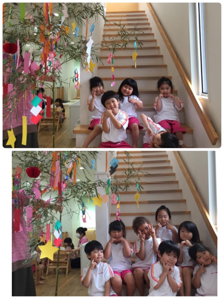 先生から七夕のお話しを聞いた後はお願い事を書いた笹の葉の前で写真撮影(^_-)-☆