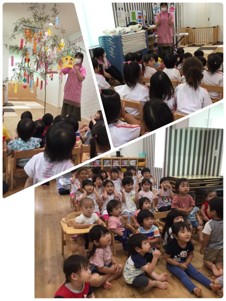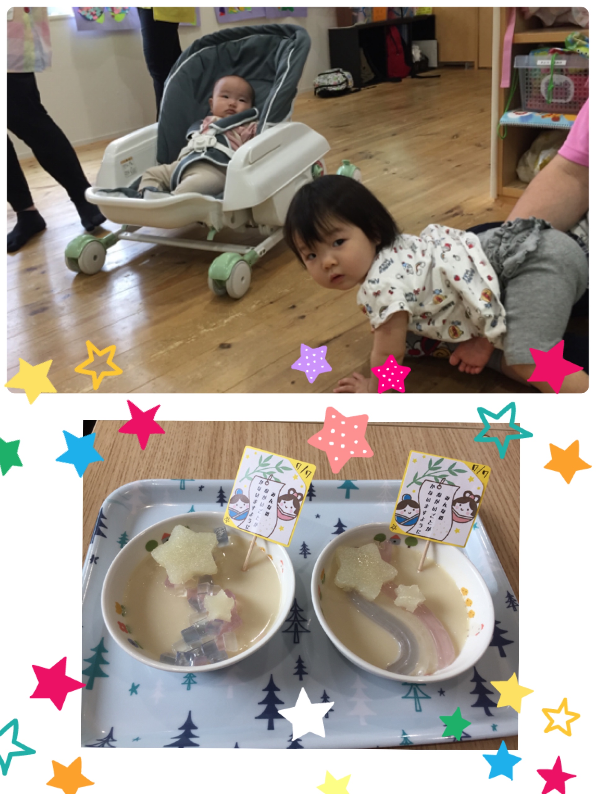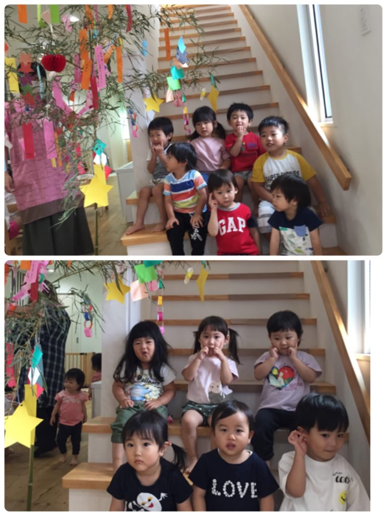 こんにちは!吉塚園です(*^^*) 今日は七夕会をしました☆☆☆ 先生から七夕のお話しを聞いた後はお願い事を書いた笹の葉の前で写真撮影(^_-)-☆ キラキラ星がたくさんの天の川もみんなで渡りました~♪ 織姫さんと彦星さん会えるといいね( *´艸`) 今日のおやつは七夕特別メニューです(*^^*) 天の川にキラキラお星さまが輝いていてとっても可愛いおやつです☆彡 また明日の登園待っています(*^^*)
