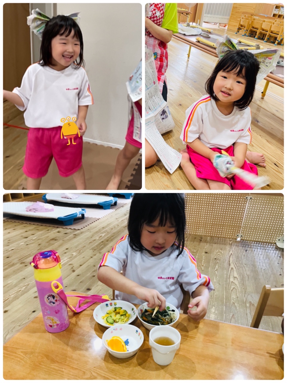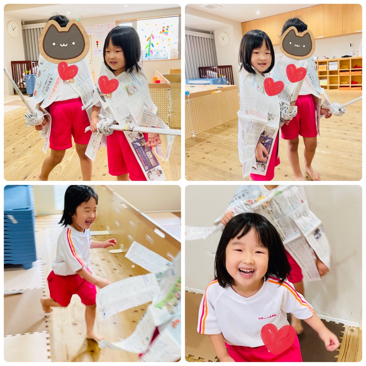 今日は久しぶりに良いお天気ですね(*^▽^*) 登園してからはプログラミングで遊びました! アイスを作ったり、机を作ったり楽しみました☺️ お友だちが来てからは、新聞紙遊び! 『鬼滅の刃』が大好きな2人と一緒に鬼滅ごっこをしました☆ 先生が鬼になりきると「きゃー!」「にげろー!」と逃げていましたが、日輪刀を持って立ち向かう姿もありましたよ(^o^)/ 明日も晴れますように(*^_^*)