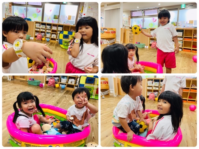 こんにちは博多園です☆ 今日も子ども達は元気いっぱい。 朝はみんなで朝の会♫ ほし・おひさま組さんはボールプールで遊びました。 沢山ボールがあって楽しいね(^^) つき組さんは絵本読みにシール貼り。 おばけのシールをペタペタ。 あおぞら・ひかり組さんは、腕時計を作ったり 人形やトンネルで遊んだよ。 雨でも子ども達は元気いっぱい! 明日も元気に登園してきてね。 待ってるよー。