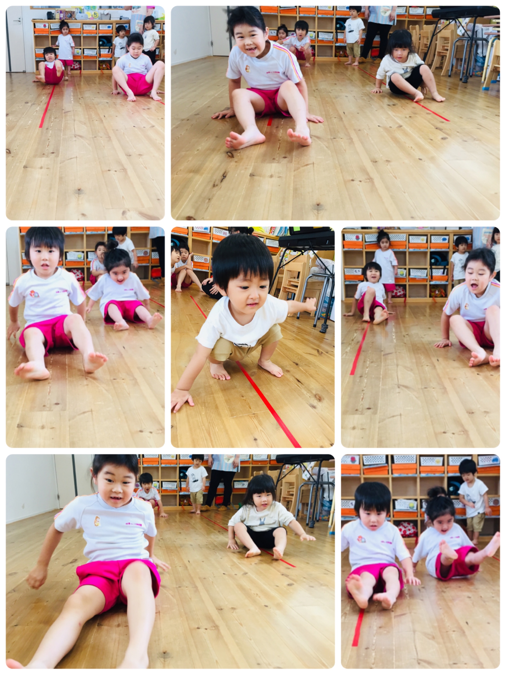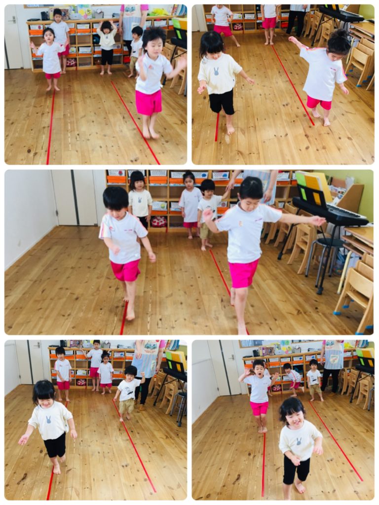 床に貼った赤いテープを使って運動です(^^♪
