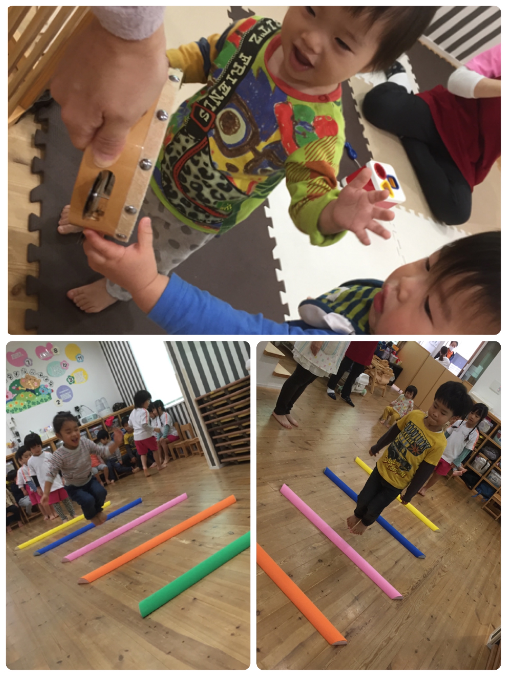 今日は全員で室内で遊んで過ごしました◎ 絵本やダンス、運動遊び、雑巾掛け競争等たくさん身体を動かして楽しみました(^ ^) ジャンプしてタンバリンにタッチしたり、平均台を落ちないように渡ったりジャンプで飛び越えたりして大盛り上がりの子どもたち! 最後はみんなで雑巾掛け競争をして、保育者やお友だちと競争して楽しみましたよ♪ 明日も元気に登園していっぱい遊ぼうね◎