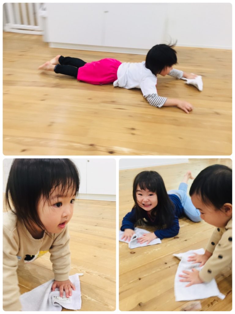 最後はみんなで雑巾掛け競争をして、保育者やお友だちと競争して楽しみましたよ♪