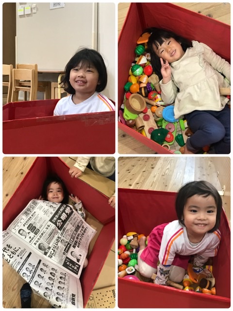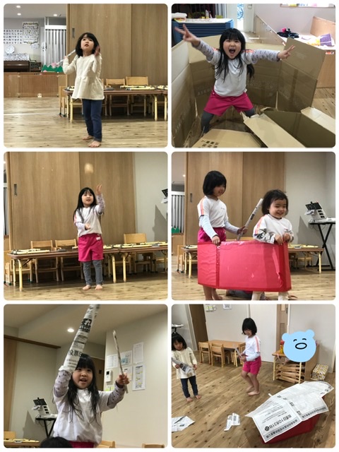 こんにちは☀︎博多園です。 今日は4人とお友達が登園しています。 朝から元気いっぱいな子ども達☆ ダンボールや新聞紙を使って 素敵なお部屋を作っていましたよ!! ドラキュラのお部屋を作っている お友達もいました(*゚∀゚*) 子ども達の想像は豊かで面白いですね。 明日はどんなことをして遊ぼうかな?