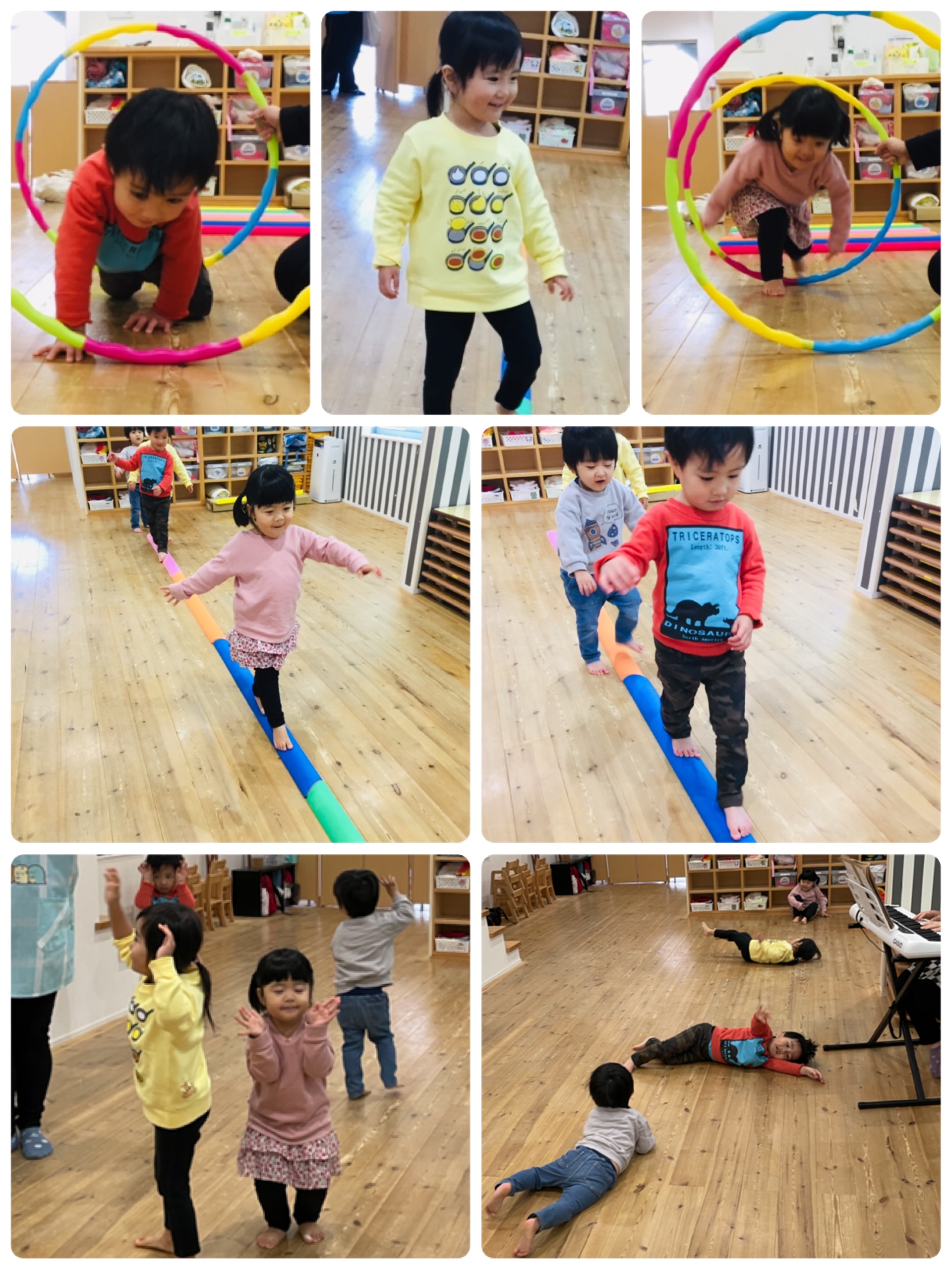 今日ほし組さん、つき組さんはリトミックで体を動かしました~♪
