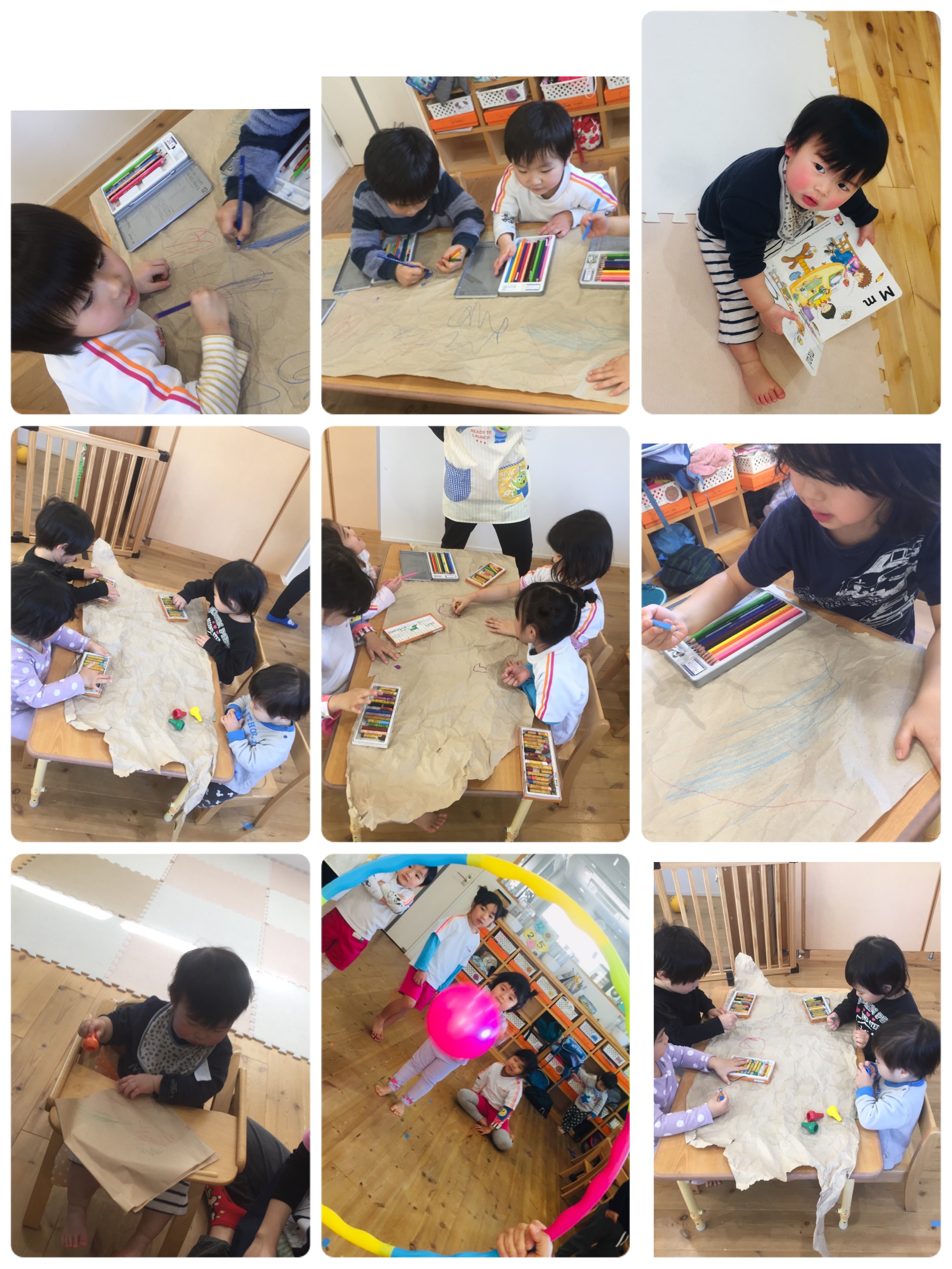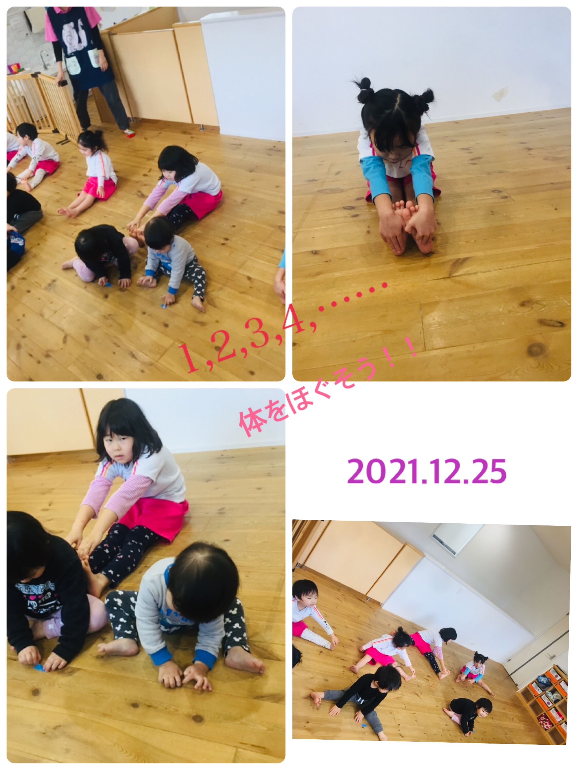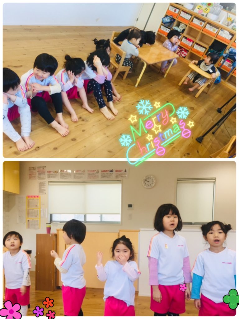 こんにちは!吉塚園です。 今日の園内は、「プレゼント~を貰ったよ!サンタさん来たよ!」と、とても賑やかです✨ みんなで朝の会をして、柔軟体操を行いました♪ 柔軟体操後、音楽に合わせて体を動かし、ボールやポンポンを使い、沢山身体全体を動かしました。 大きな紙にみんなでお絵描きも楽しみました! 明日も沢山遊ぼうね!( ´ ▽ ` )ノ♩
