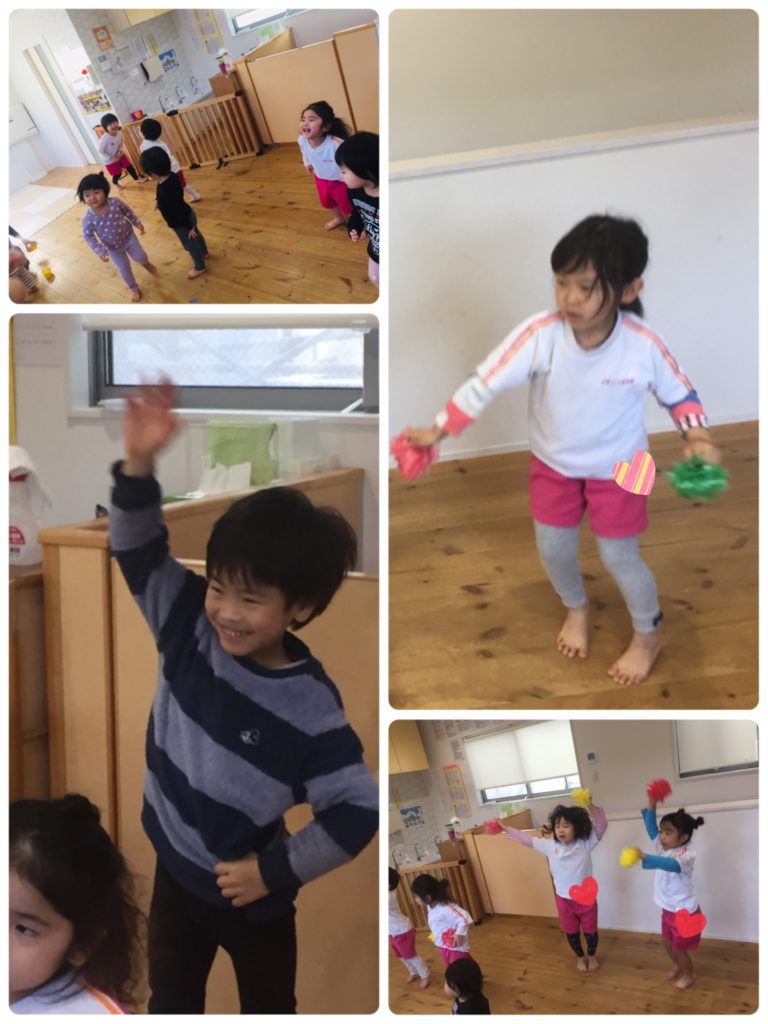 柔軟体操後、音楽に合わせて体を動かし、ボールやポンポンを使い、沢山身体全体を動かしました。