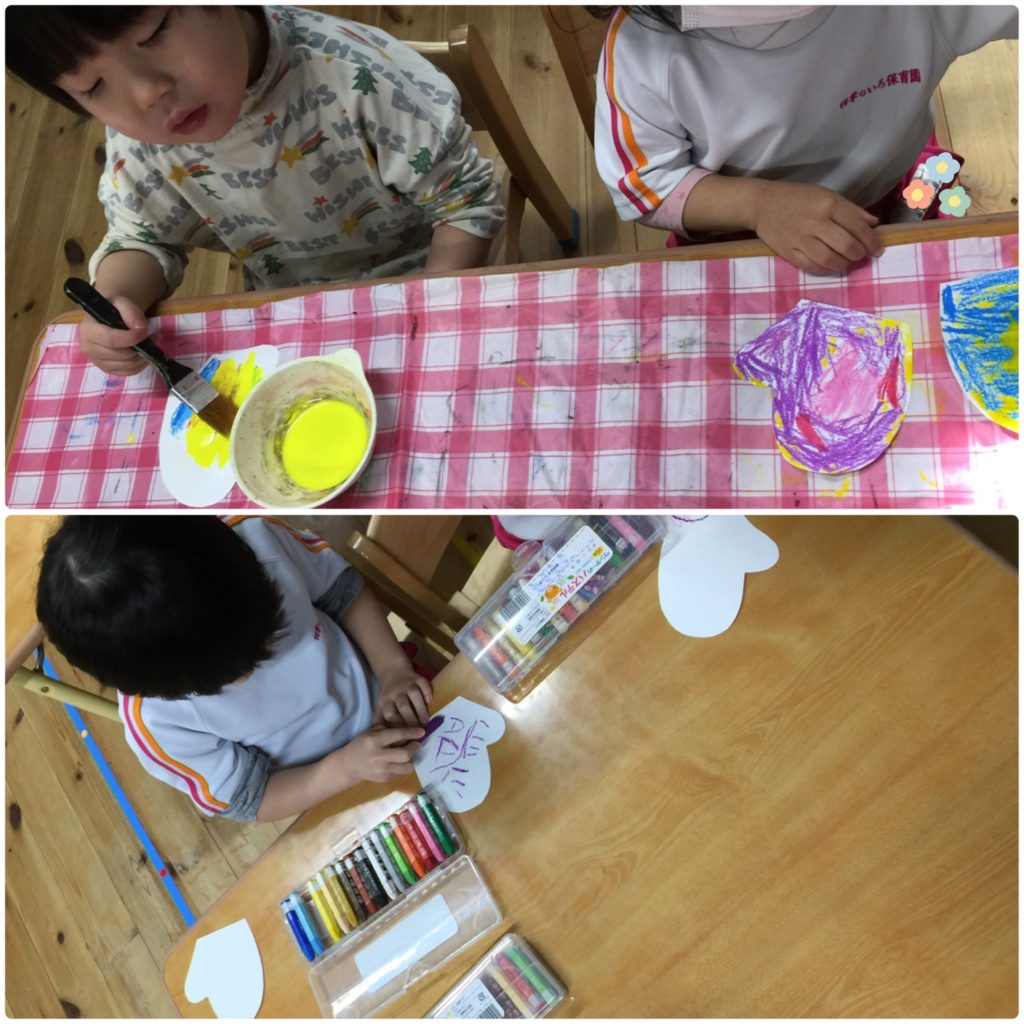 うさぎ組さんははじき絵の制作、ぱんだ&ぞう組さんはテキストでお勉強!