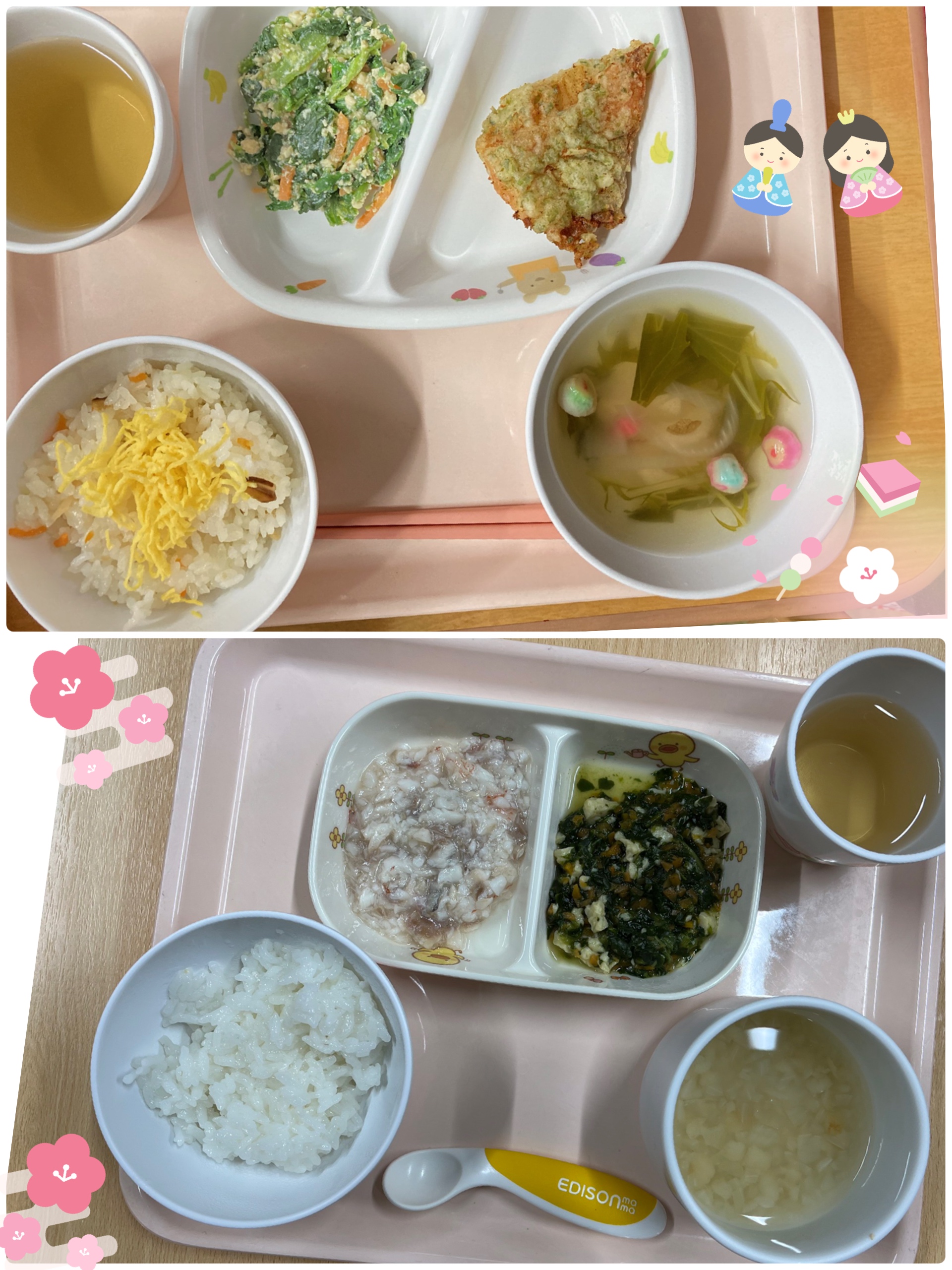 ちらし寿司、赤魚の磯辺揚げ、ほうれん草の白和え、みずなのお吸い物