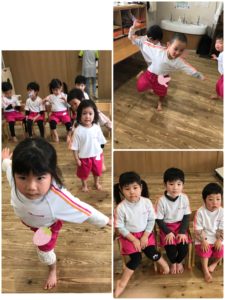そして、つきぐみさんは、マット運動を、以上児さクラスのお友達は、リトミックをしましたよ!