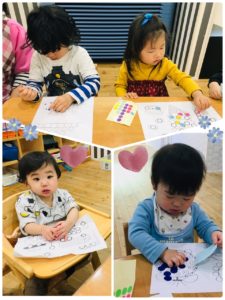 今日は、室内でシール貼り、塗り絵、リトミックをしましたよ✨