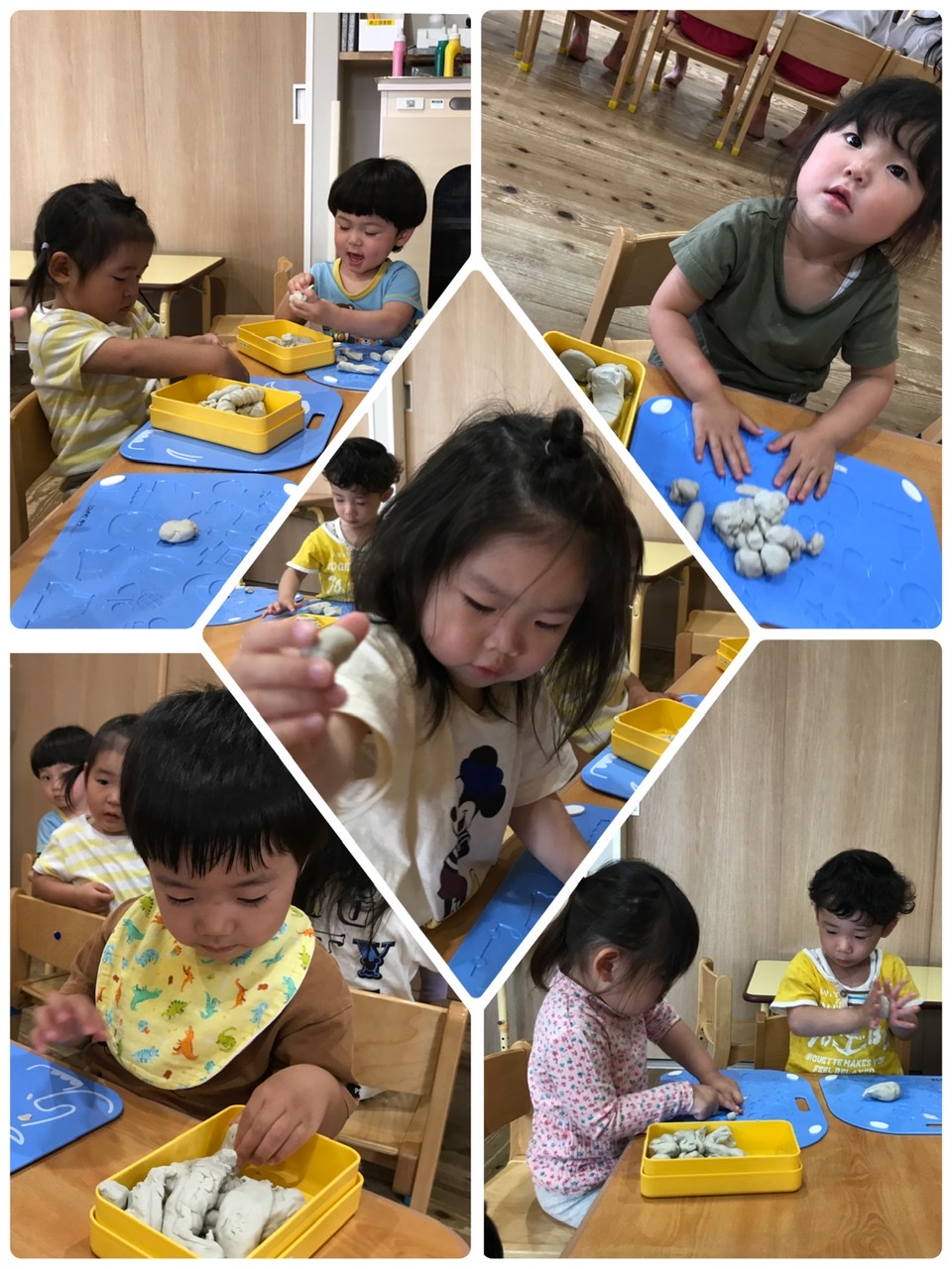 コネコネ丸めてみたり、ちぎってみたり思い思いに遊んでいました♪