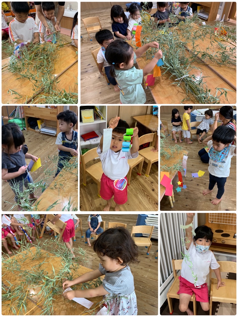 博多園では明日七夕会をするので、みんなで笹に七夕飾りを付けました!!