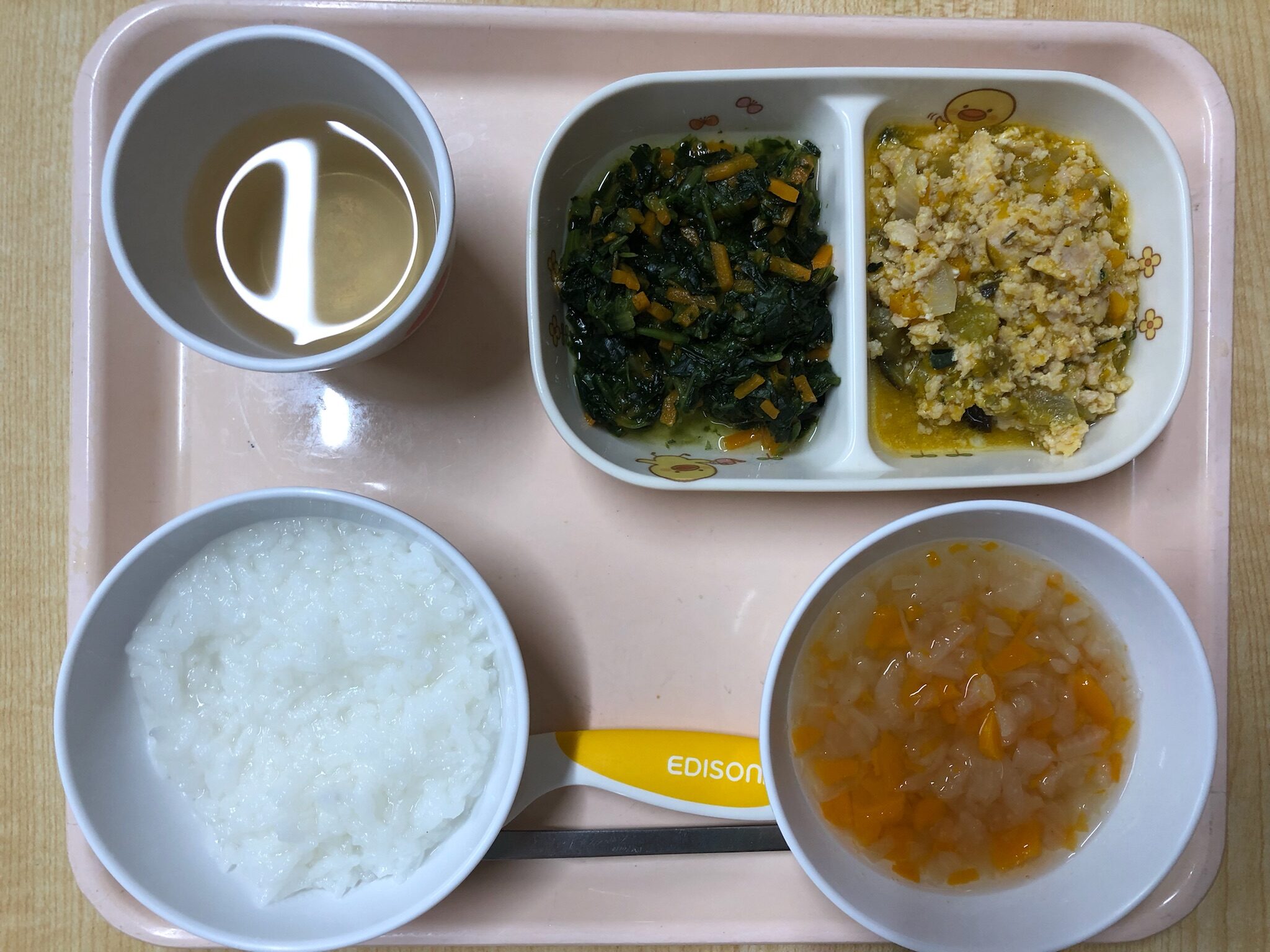 ごはん、かぼちゃと豚ひき肉の煮物、ほうれん草の和え物、大根のスープ
