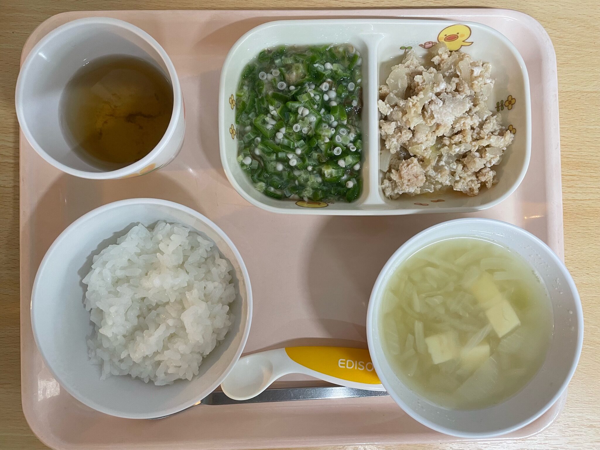 ごはん、豚ひき肉の煮物、オクラのおかか和え、玉ねぎの味噌汁