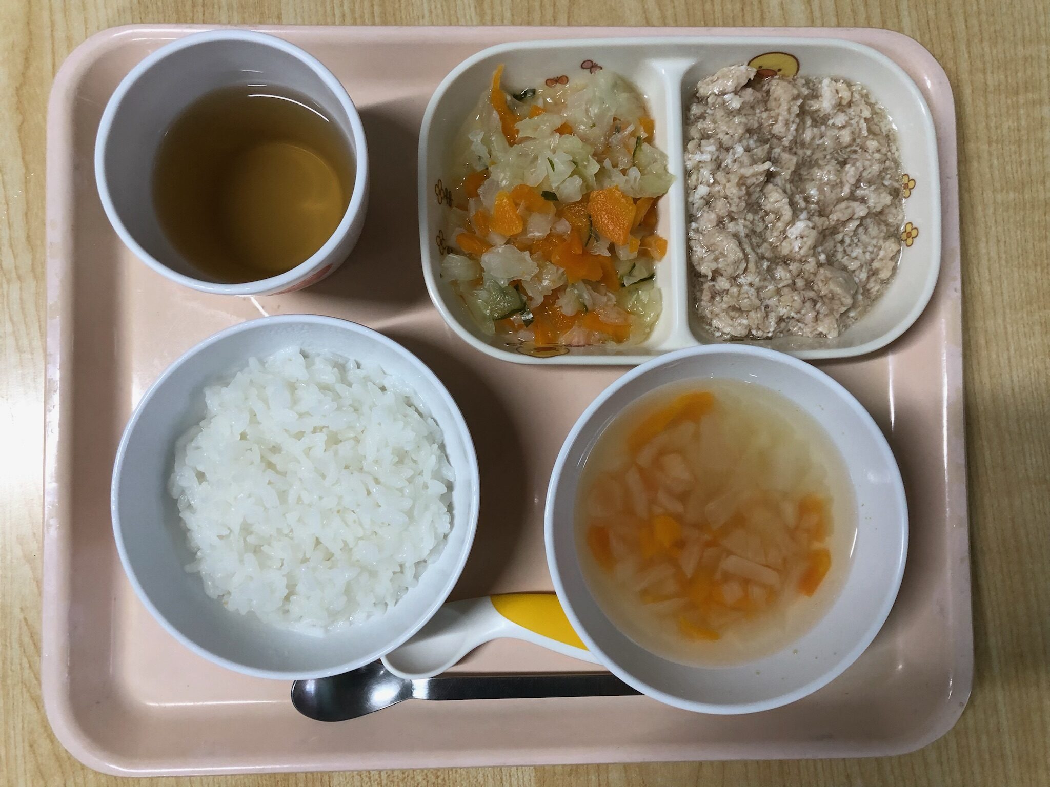 ごはん、鶏肉のとろとろ煮、キャベツのくたくた煮、オニオンスープ