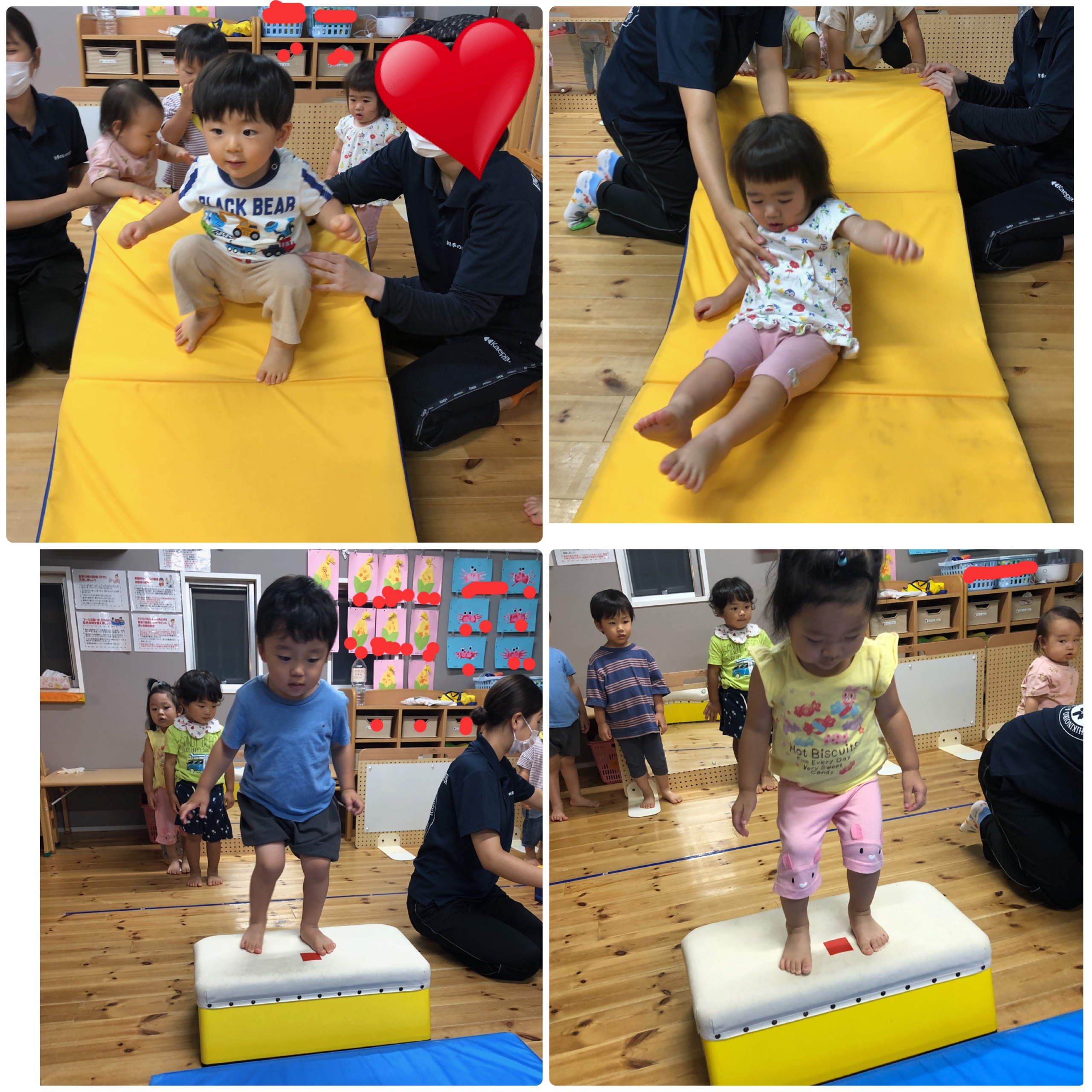その後はひよこぐみ、りすぐみ、ねずみぐみさんはすべり台を滑ったり、跳び箱運動をしたりとたくさん体を動かしました。