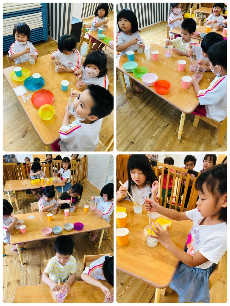 材料を自分達で選びお水に入れ混ぜて洗濯のりを入れ固まっていく姿に驚いていました(*^_^*)