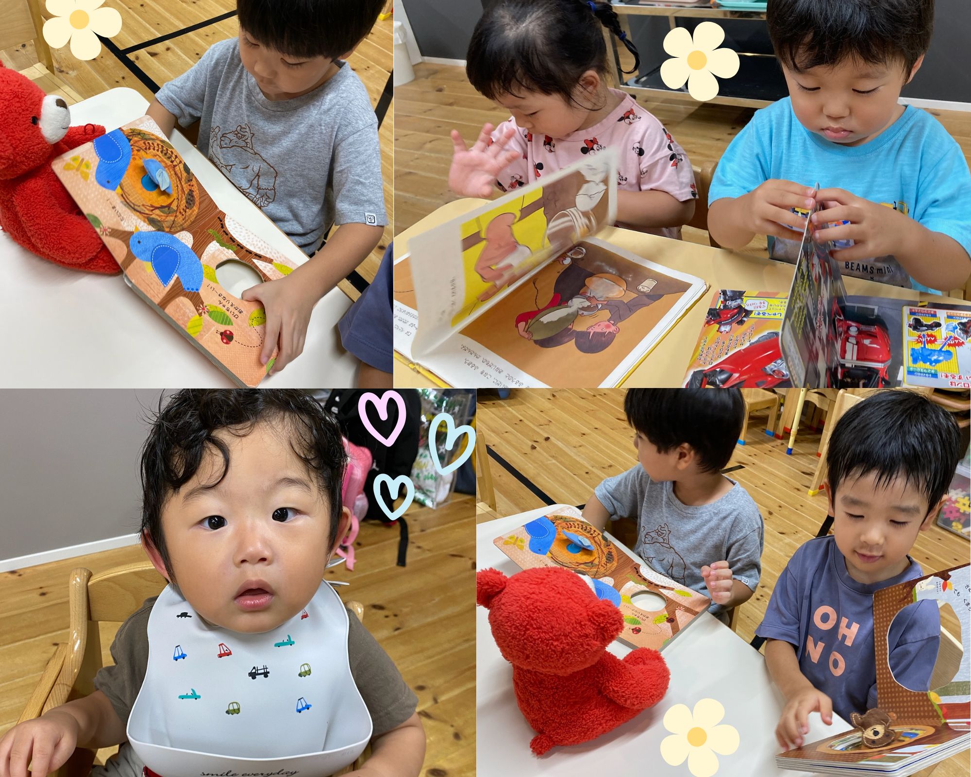 また、文字を読める以上児さんは、絵本の文字を一文字ずつ読んで楽しんでいました。